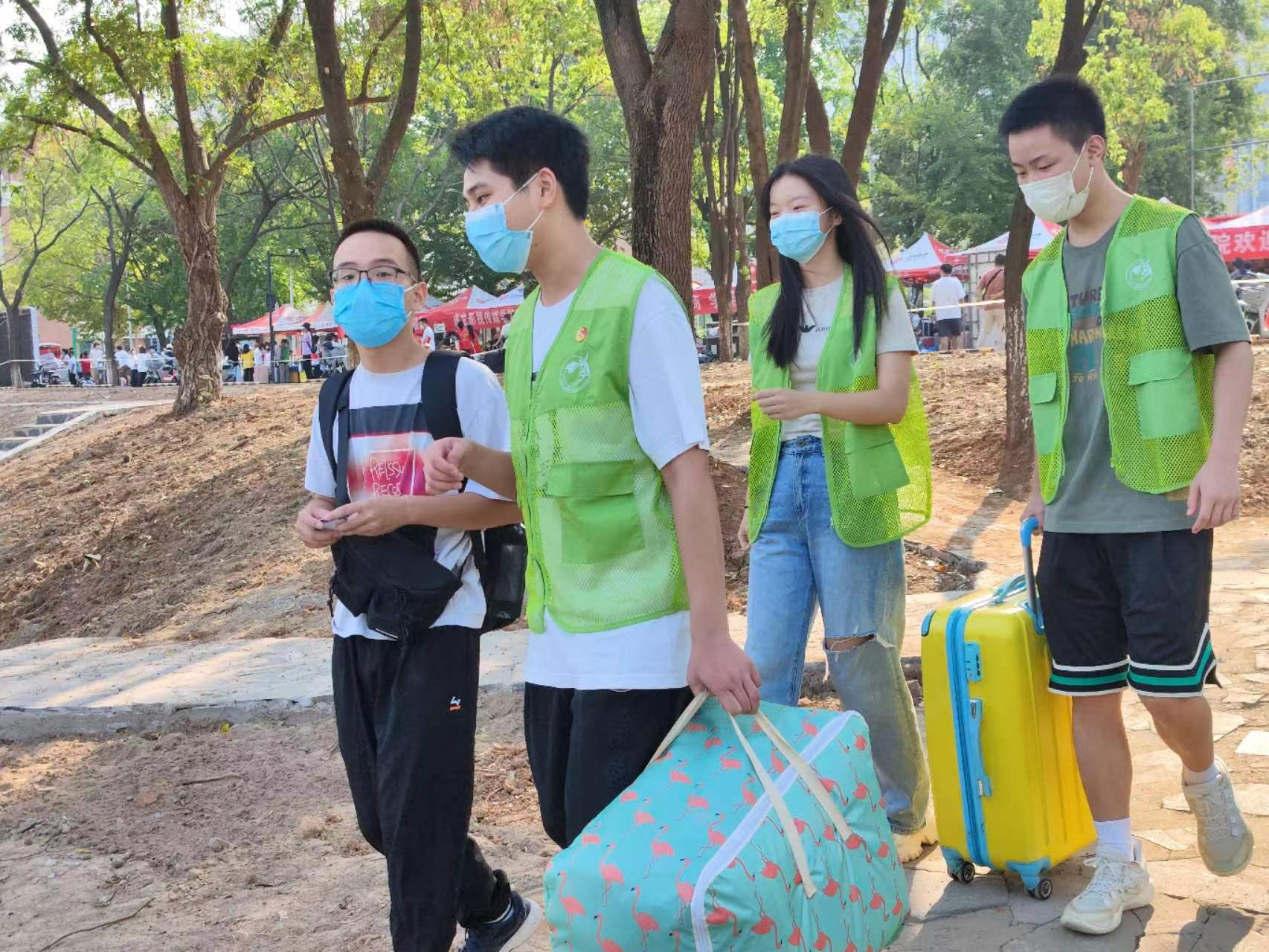 我院在2、5、6号宿舍楼下安排了学生党员志愿者,在因疫情防控家长无法入校之际,帮助新生将行李运送上楼。