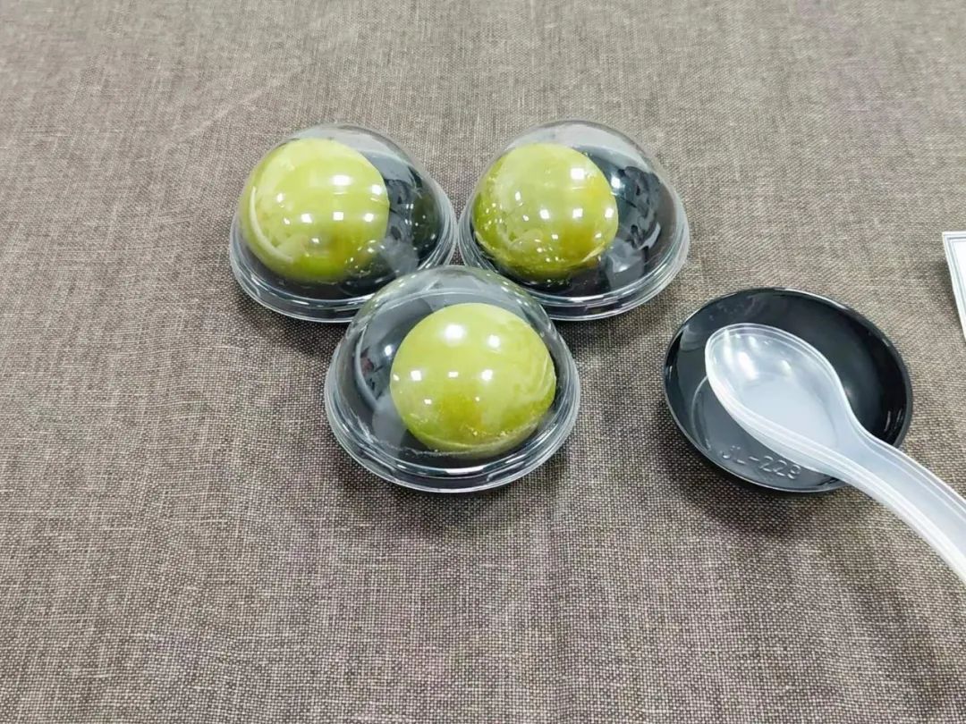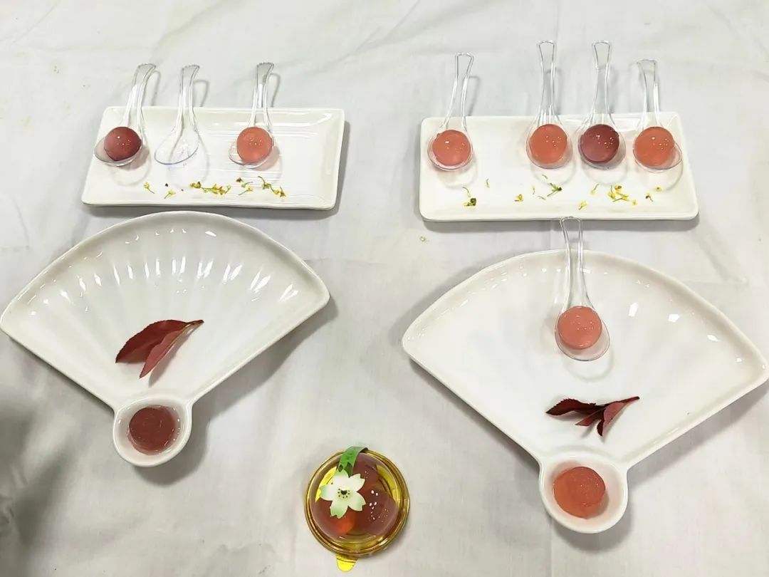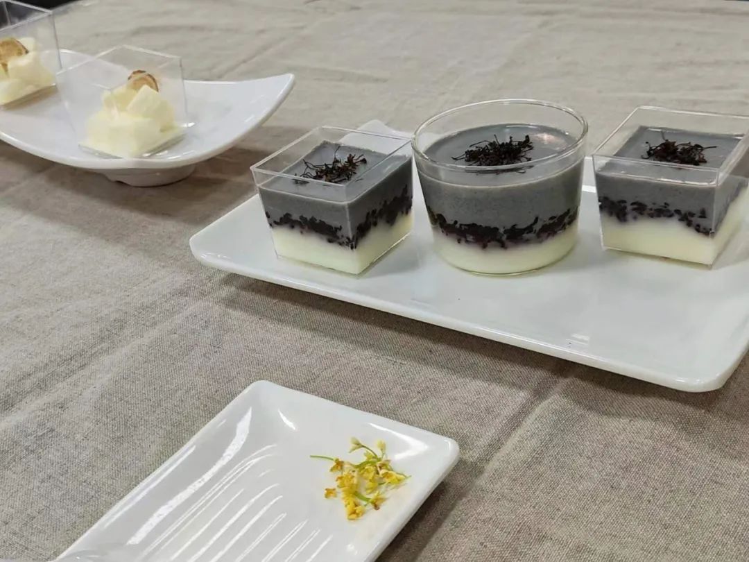 “琉璃眼”酸奶晶球:“琉璃眼”酸奶晶球是一款以中华传统茶艺工序结合健康美味的酸奶制成的一款具有开创性思维的创新性小食,采用中国传统饮品乌龙茶叶提取后制成茶冻,开创式地在其中包裹流动性酸奶,制作出的一款具有晶莹剔透外表的酸奶琉璃球小食。