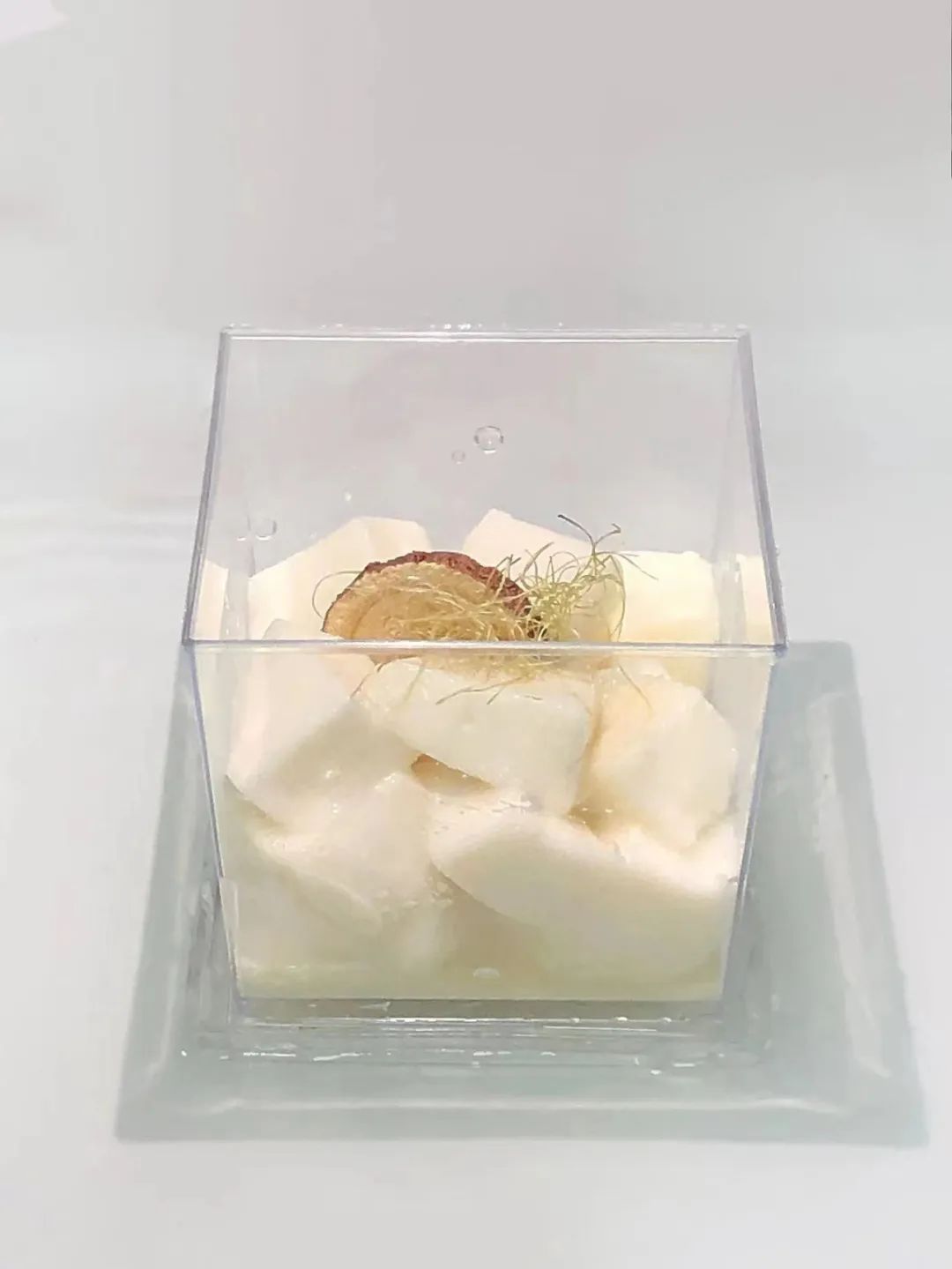 “水云间-万象”酸奶冻:本产品用椰桨代替牛奶发酵,添加芒果、构杞、百合等辅料制成酸奶冻。奶块外层包裹着菊花茶冻、玫瑰茶冻、桂花茶冻,每种口味能满足不同消费者的需求,菊花芒果酸奶冻—疏风清热抗疲劳,适合白领;玫瑰构杞酸奶冻—美容养颜、减脂 塑形,造合减脂;桂花百合酸奶冻—滋养肠胃清心安神,适合养生。