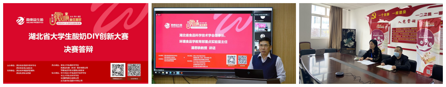 此次大赛采取线上线下相结合的方式组织开展,赛事委员会组织在部分高校举办线下巡讲活动,让专家走进课堂进行益生菌知识的科普并进行现场答疑,引用多媒体传播方式,在公众号、微博、抖音等多平台宣传传播,并通过抖音集赞评选最佳人气奖,与往届相比,借助本届酸奶DIY大赛的契机,特搭建食品类毕业生与用人单位之间安全、便捷、高效的线上精准对接平台,举办“2022年秋季学期食品类人才空中双选会”。我校两支参赛队伍于2022年12月12日在临湖轩B3059进行线上答辩。