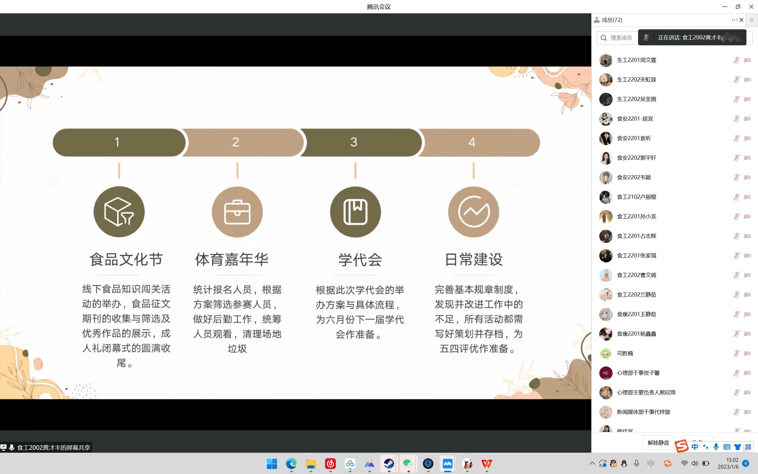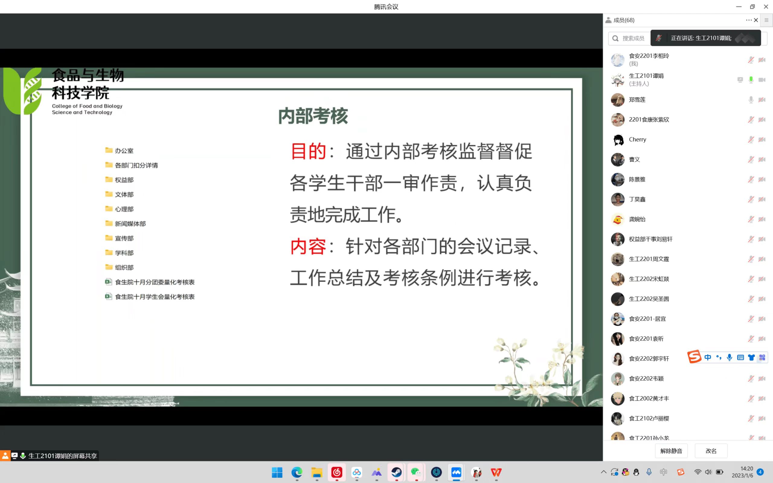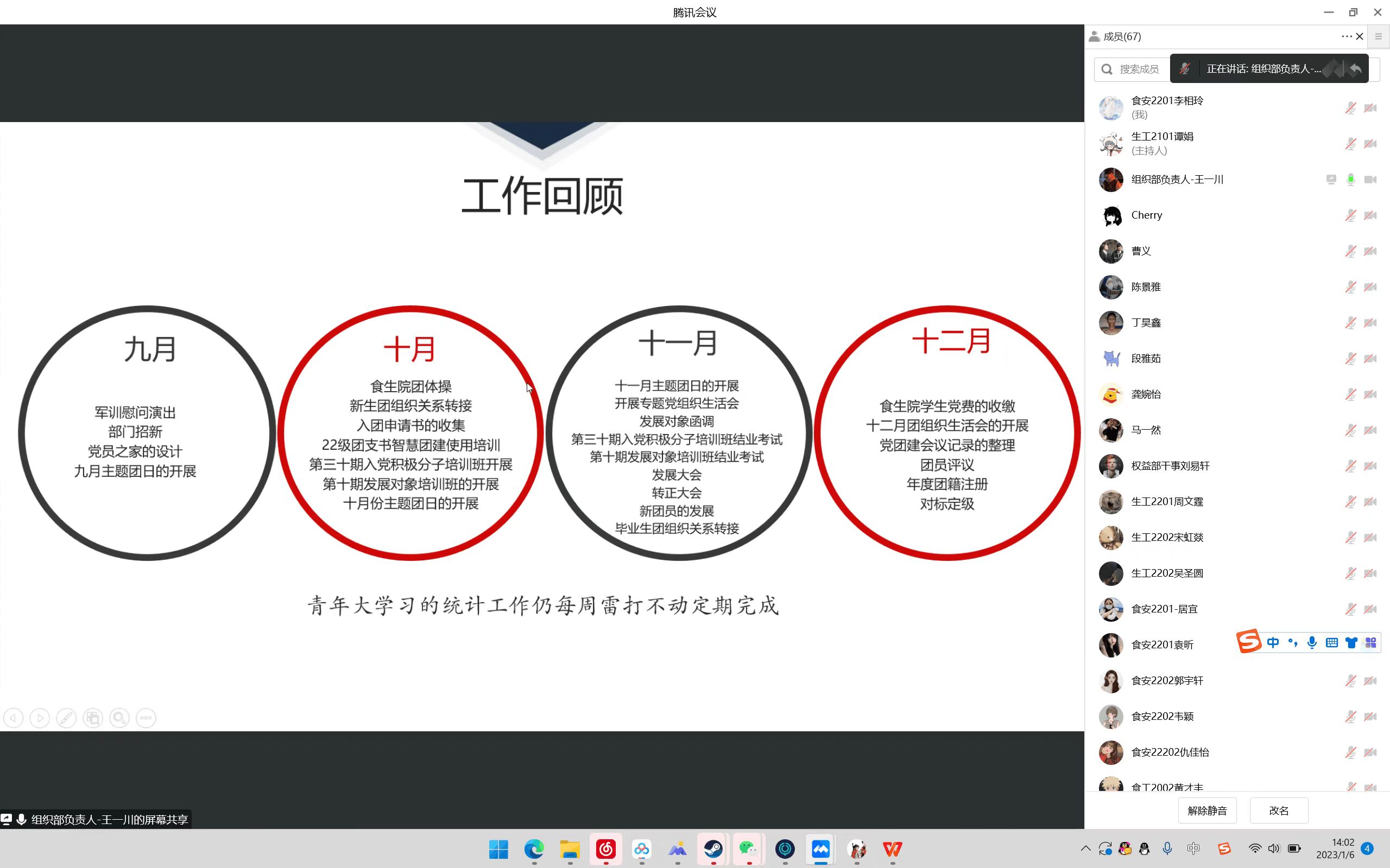(通讯员 兰静茹 李相玲)为了总结回顾本学期学生会的各项工作,进一步开展和落实新学期的工作任务。我院于1月6号14:00以线上方式召开了2022-2023-1学年第一学期分团委学生会述职评议大会。参加本次会议的主要有分团委负责人张智、21级辅导员朱广寿、22级辅导员龚婉怡及分团委学生会全体成员,此次会议由学生会办公室工作人员袁昕主持,由分团委学生兼职副书记、主席团成员及各部门主要负责人对本年度的工作进行总结。