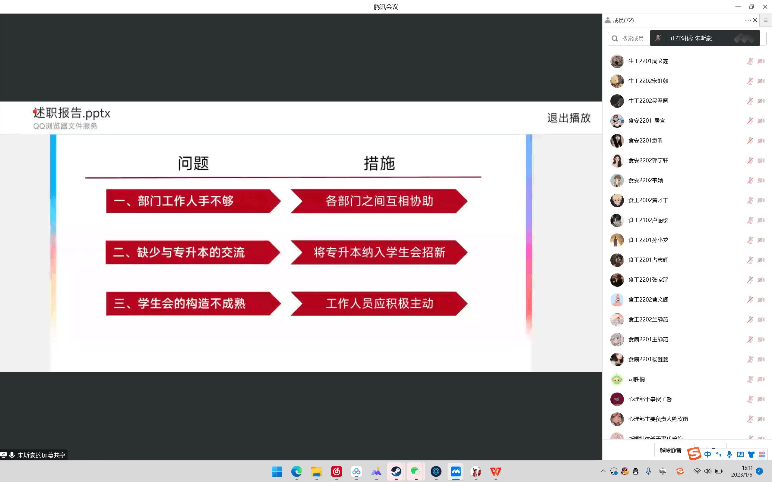 首先,各部门主要负责人依次进行述职汇报,分别从工作回顾、完成情况、不足与改进及未来计划四个方面进行汇报。脉络清晰,内容详实,充分展现出学生组织的活力与创造力。其次,分团委学生兼职副书记郑雪莲发言。她对分团委各部门的发言进行总结,也对接下来的工作提出了要求:尽可能“沉下来工作”,加强部门的联系,工作更细心等等。紧接着,由主席团成员进行述职汇报,总结工作上取得的成绩与不足,提出改进的措施与工作计划,并表示要充分发挥学生干部的模范带头作用,冲锋在前,彰显青春底色。