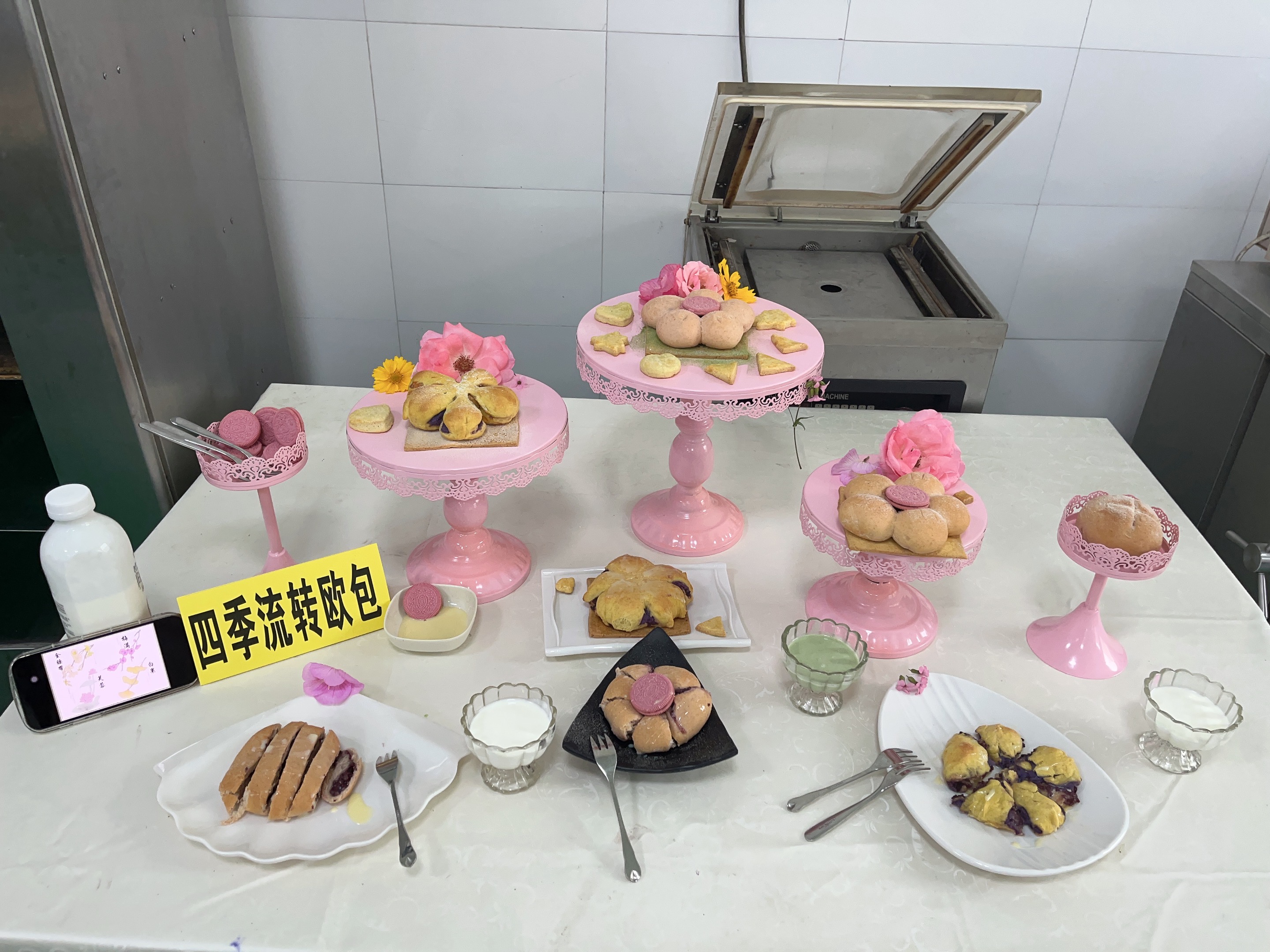 “四季流转”作品团队将欧包与饼干照片相结合,欧包外形设计源于四季不同鲜花,并以开盲盒的形式丰富欧包口味选择,用饼干打底制作相框,营造情景,用健康美味欧包记录美的瞬间。在欧包馅料中添加四季应景可食花卉和药食同源成分,让欧包在口齿留香的同时也更加健康,是一款集精致美味于一身的四季系列欧包。