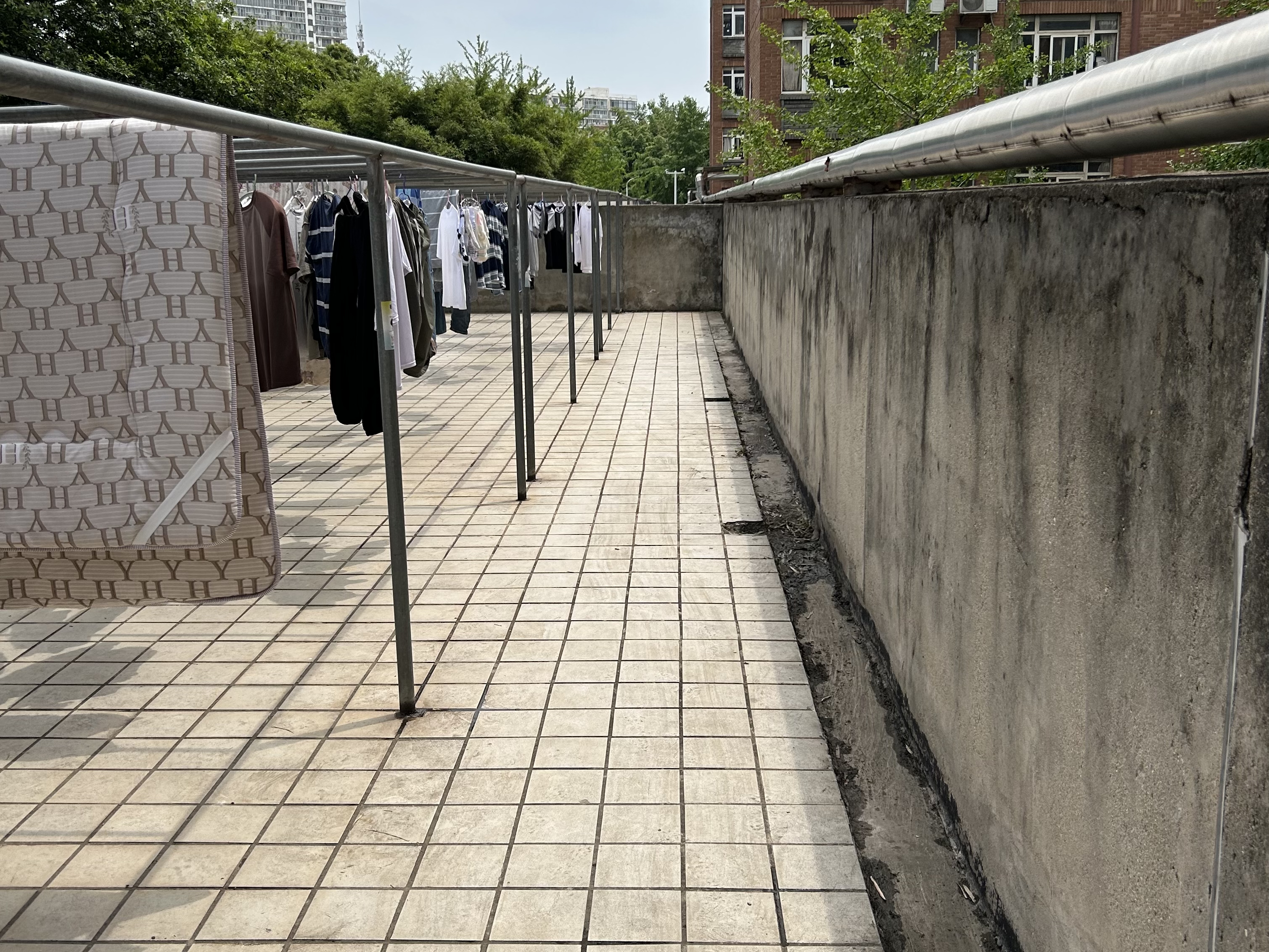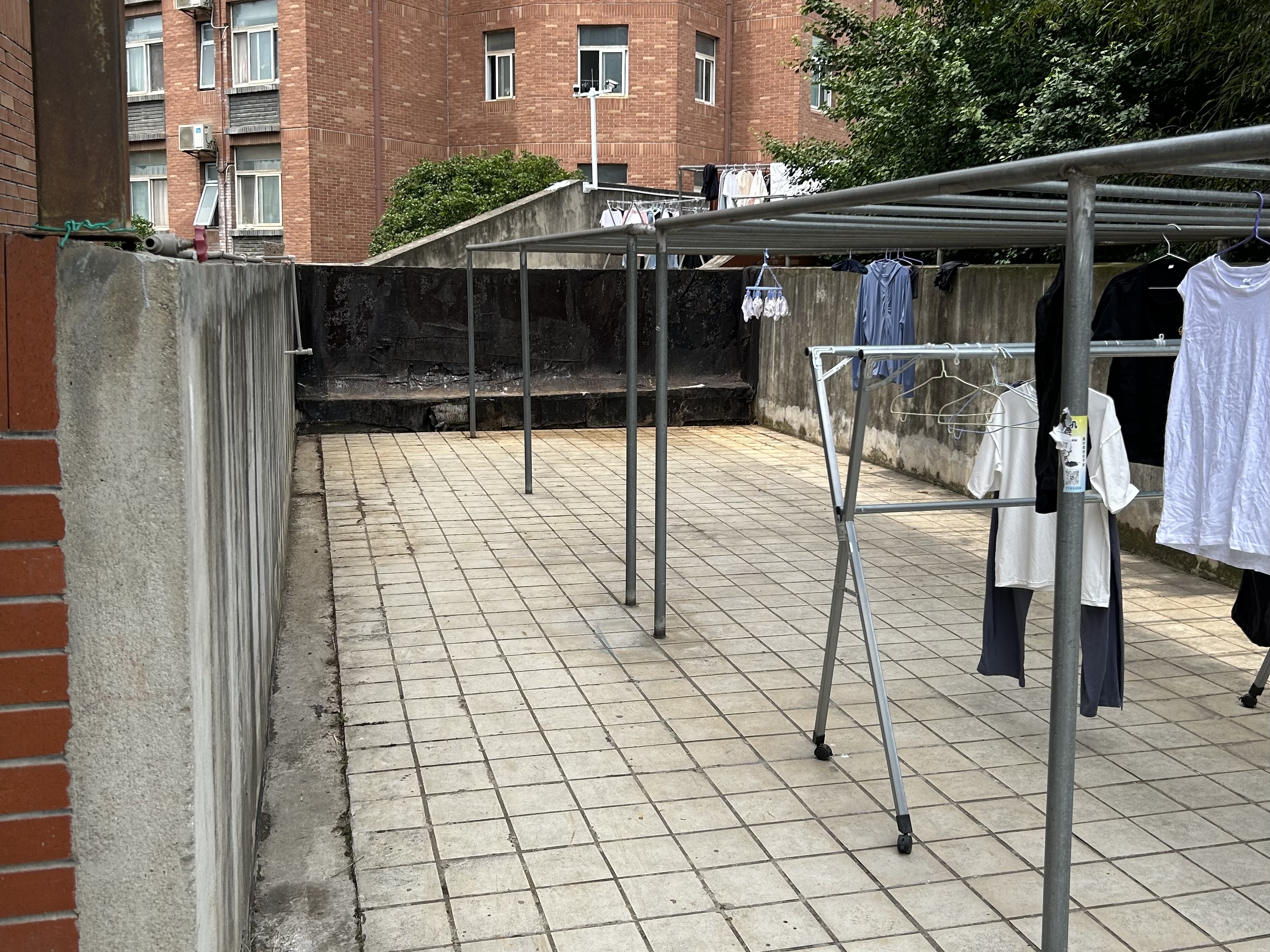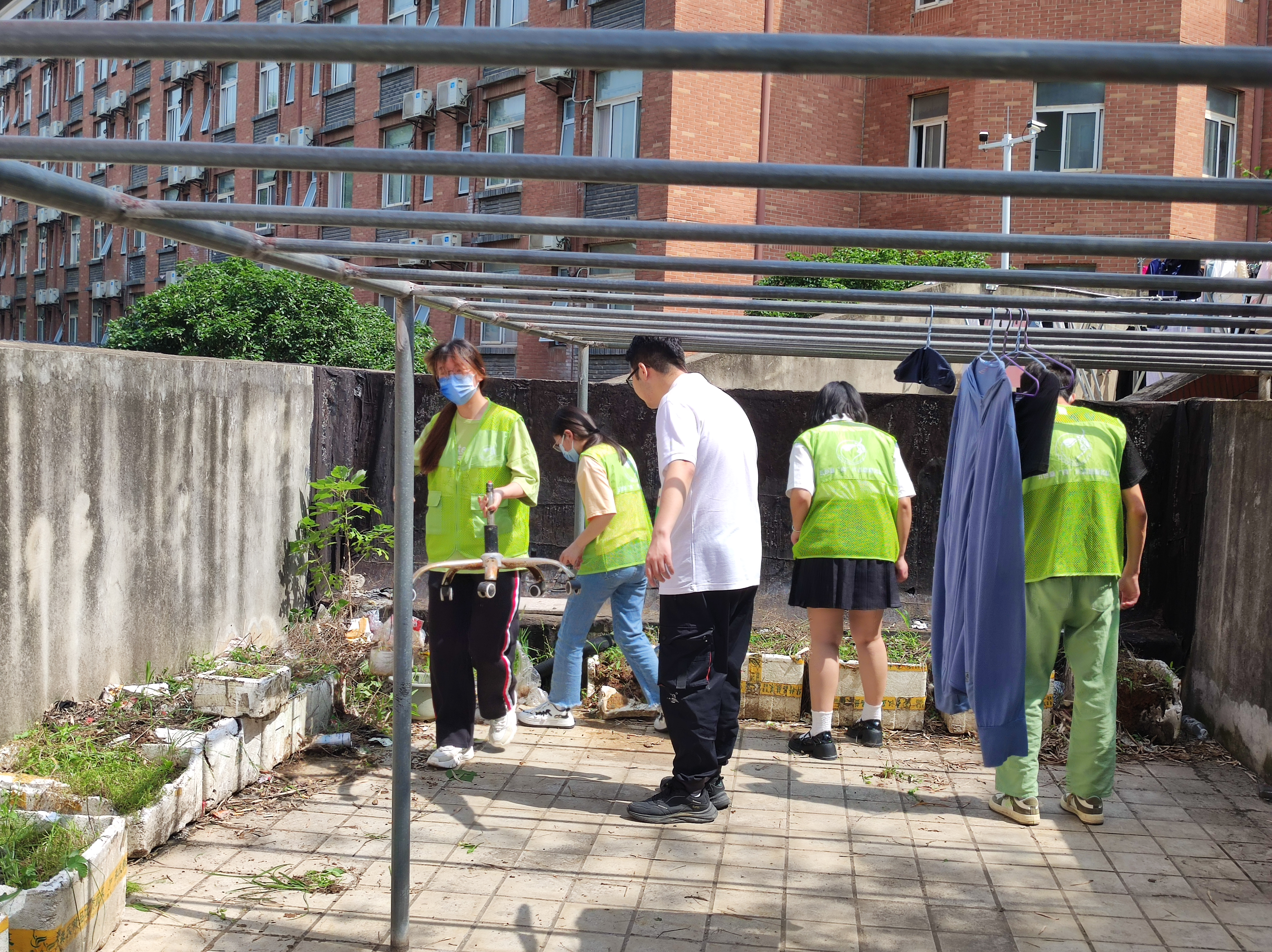 4号楼二楼露天晒台上有各种被丢弃的床单及无人认领的衣物,雨水浸泡以后十分脏乱,在这种情况下,伍小付和志愿者们依然不惧炎热,认真清理着。经过两个小时的努力,露天晒台终于恢复到了干净如初、整洁一新的样子。