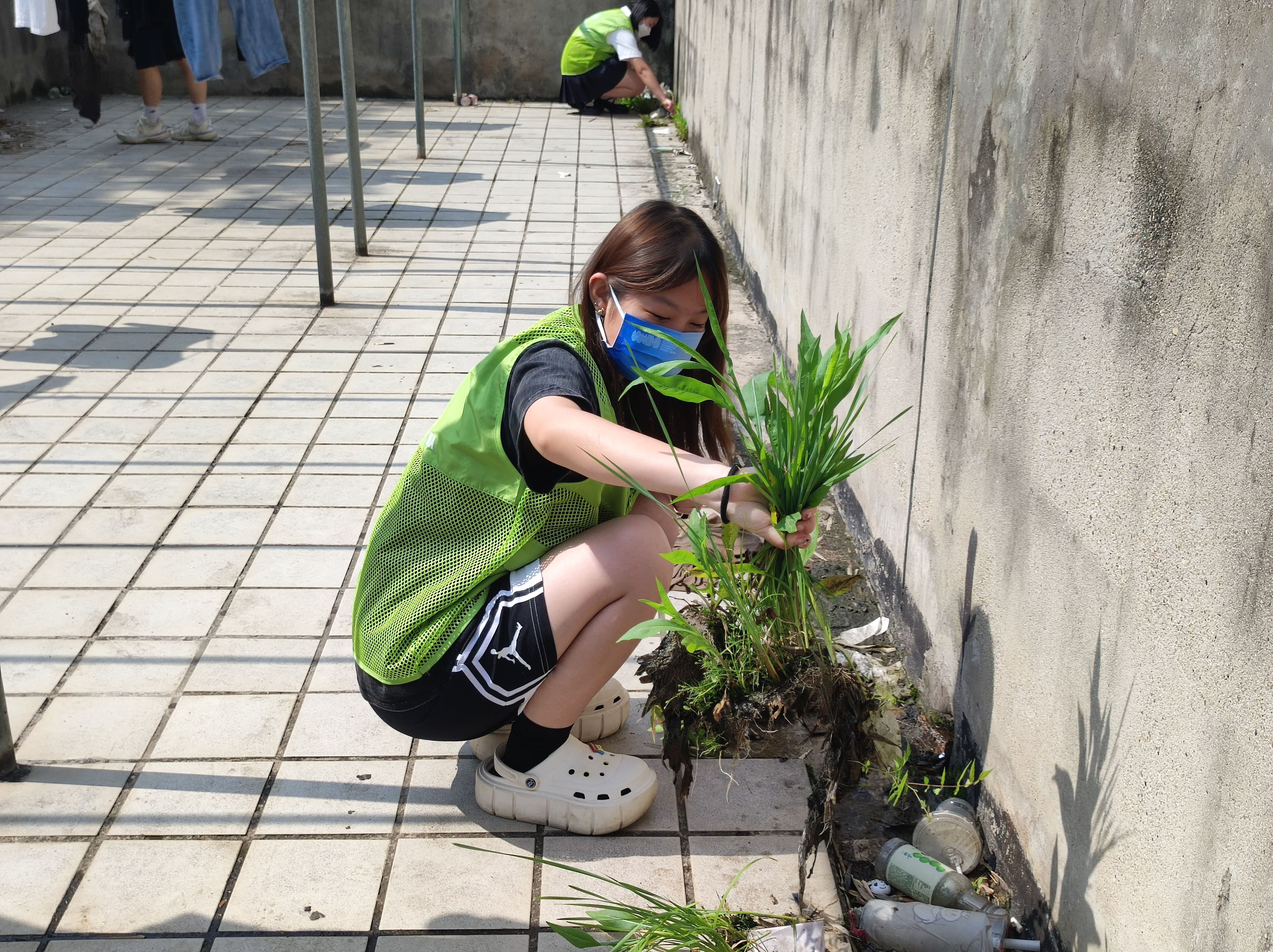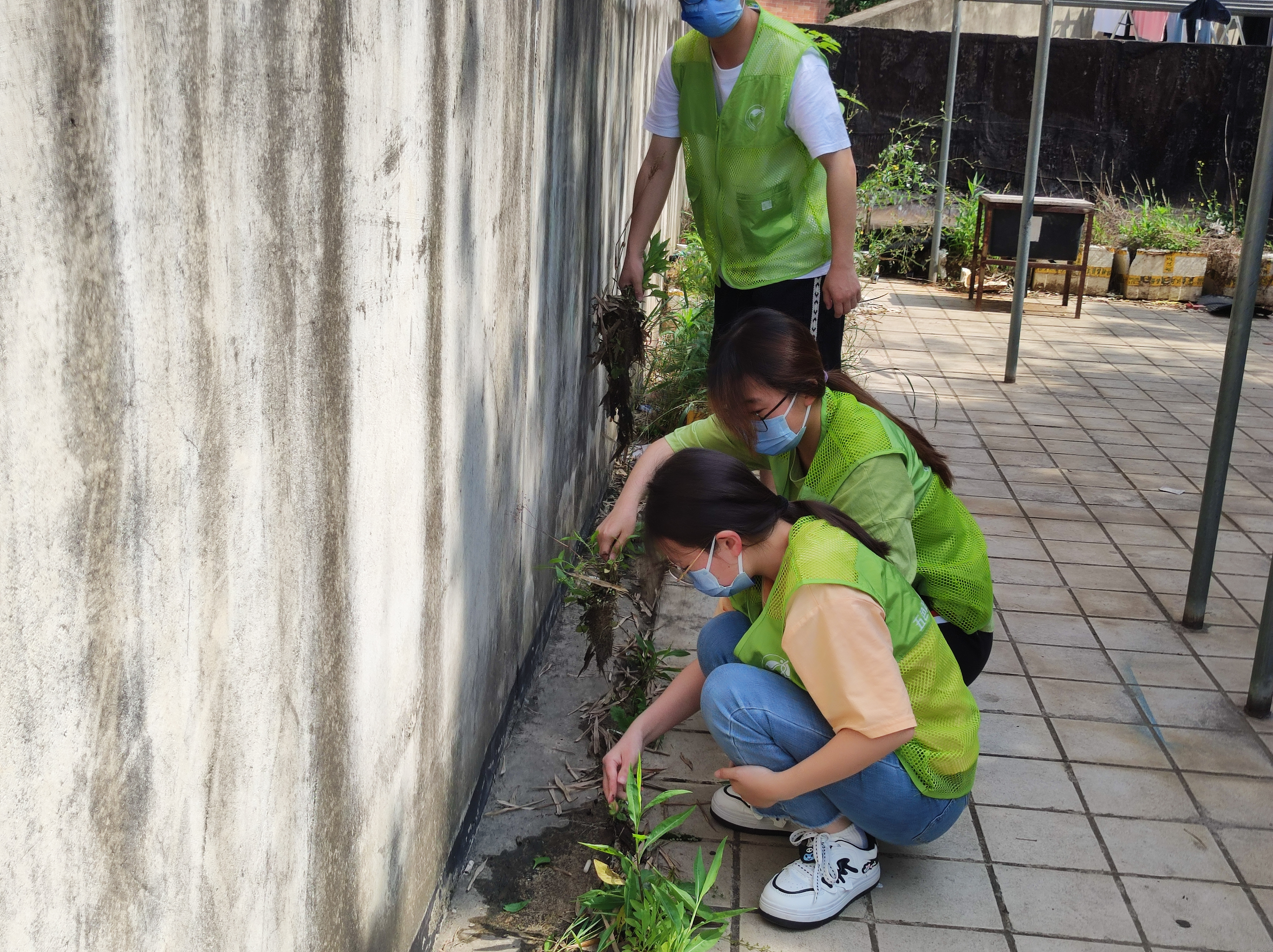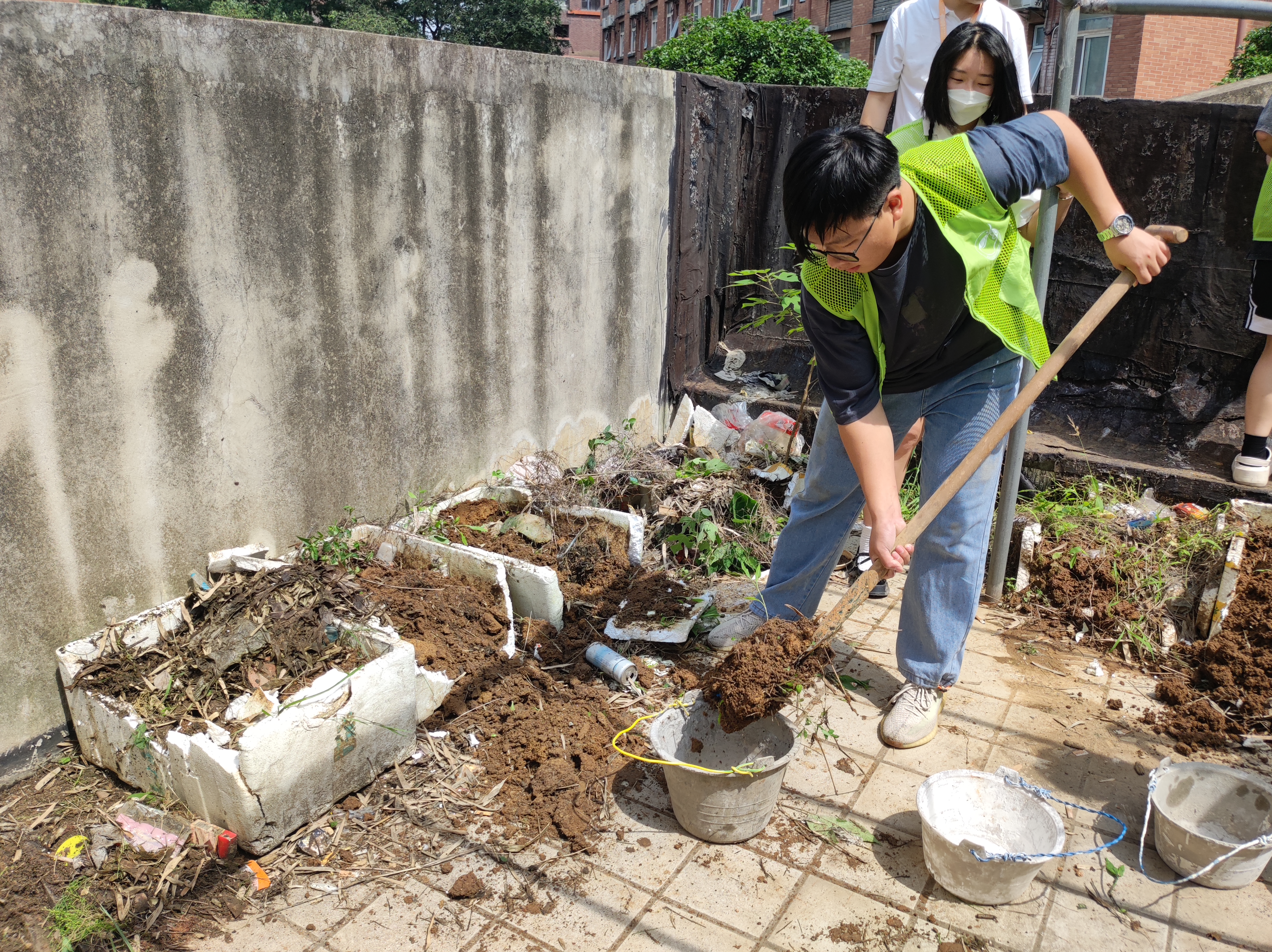 4号楼二楼露天晒台上有各种被丢弃的床单及无人认领的衣物,雨水浸泡以后十分脏乱,在这种情况下,伍小付和志愿者们依然不惧炎热,认真清理着。经过两个小时的努力,露天晒台终于恢复到了干净如初、整洁一新的样子。