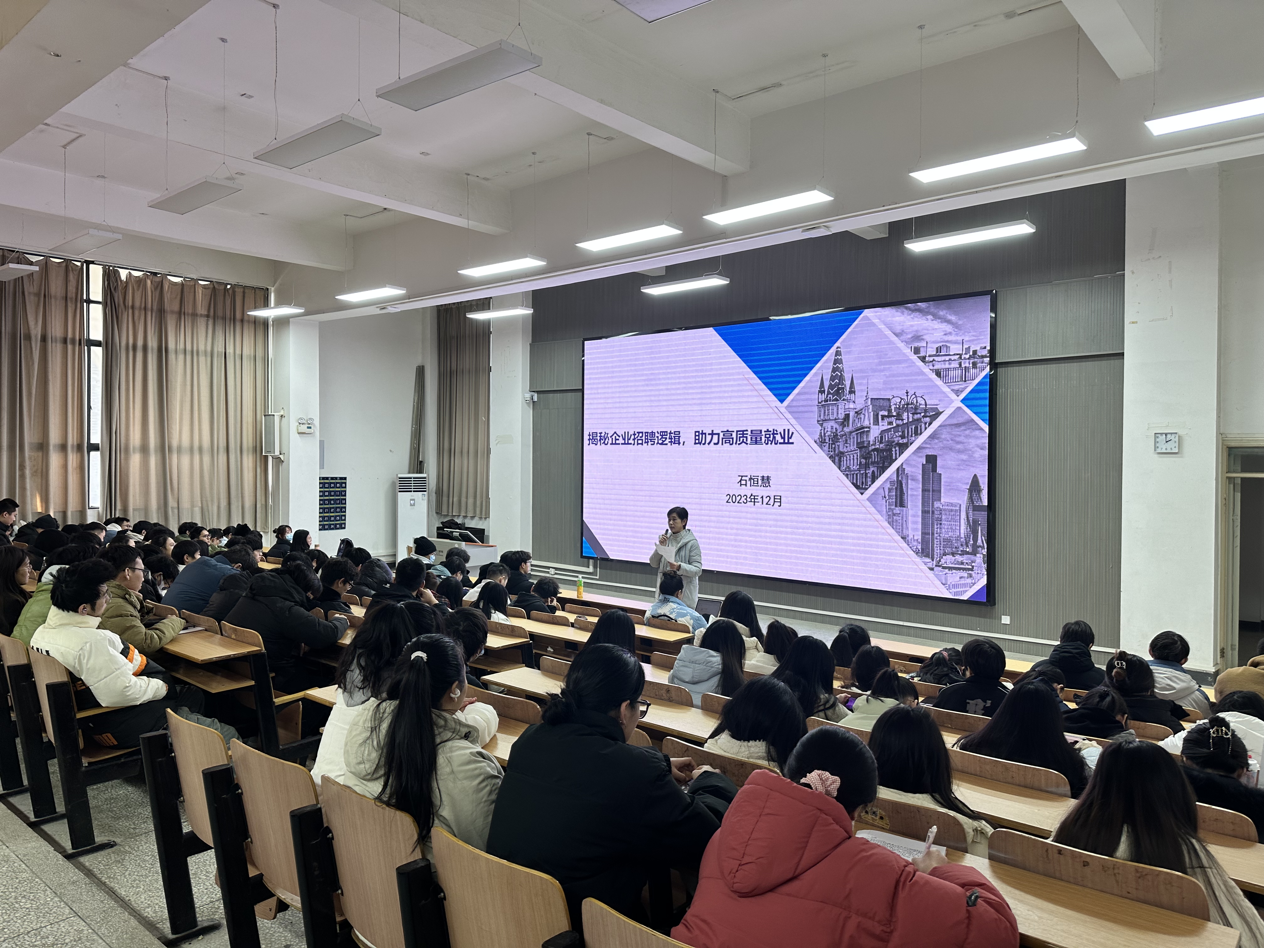 接下来,石恒慧老师为同学们带来了一场生动有趣的就业指导讲座。她从简历制作、面试技巧、职业规划等方面为同学们提供了实用的建议,帮助同学们更好地应对求职过程中的各种问题。她还详细分析了当前国内外经济形势以及就业市场的发展趋势,指出了毕业生们在就业过程中可能面临的挑战和机遇。讲座现场气氛热烈,同学们纷纷表示受益匪浅。