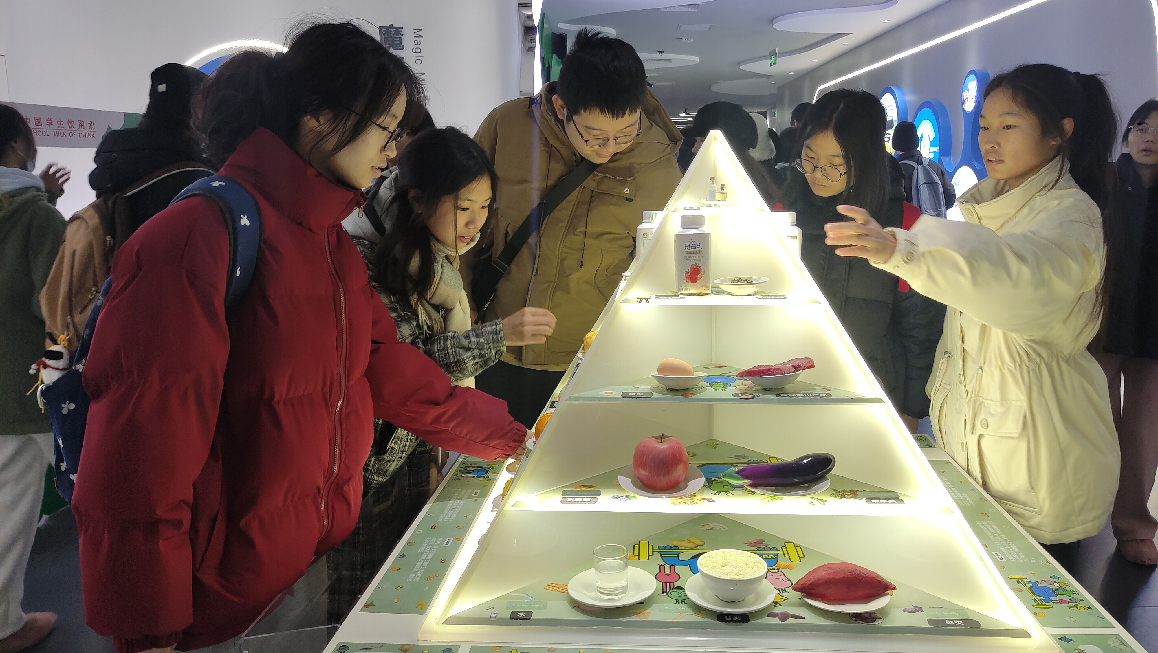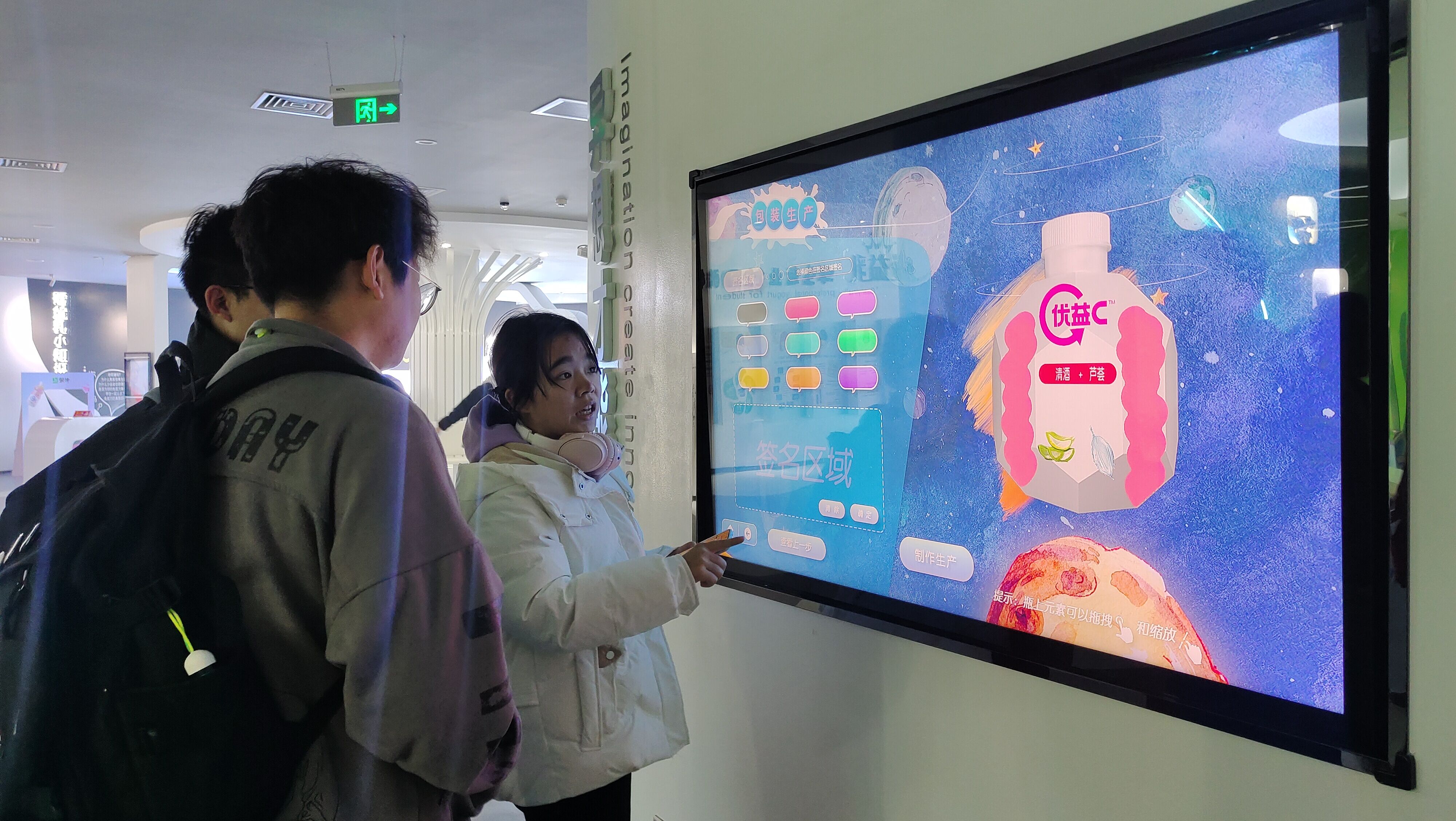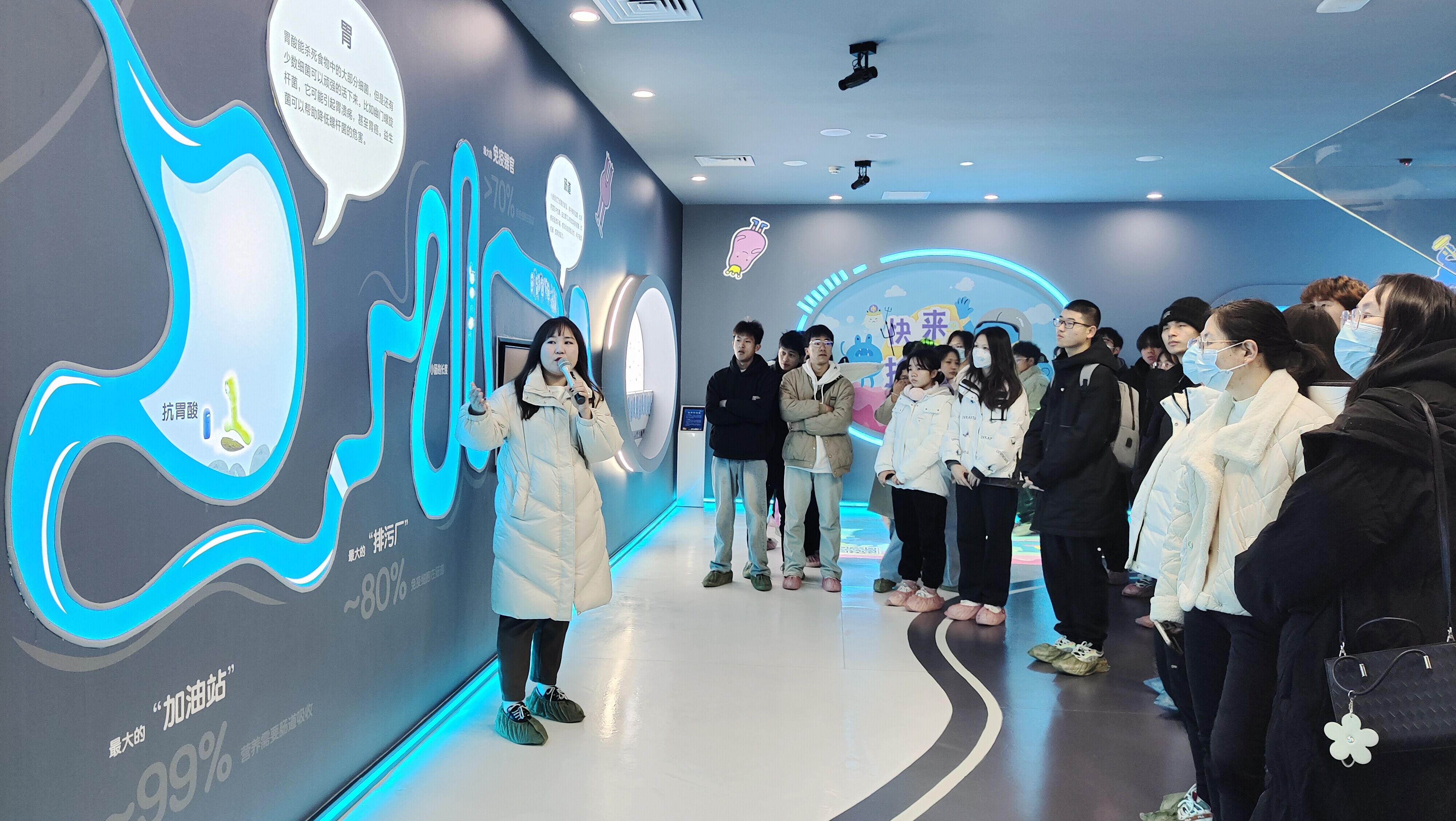 在企业展厅里,同学们了解了蒙牛企业的发展历程、品牌文化、产品家族、国内国际市场分布和推广情况;接着,同学们进入了奇幻之旅,全息影像、石墨烯感应墙、4D菌群大战游戏、沉浸式投影带领同学们认识了酸奶从古代王室走向百姓餐桌的悠悠历史,了解了酸奶的前世今生,也揭开了酸奶益生菌在肠道中的转运奥秘。