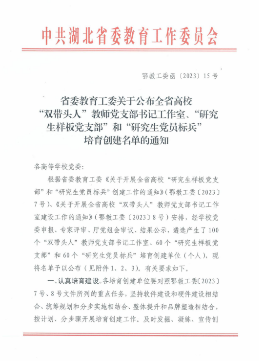 6776永利集团教师党支部书记工作室现为湖北省2023年“双带”教师党支部书记工作室创建对象,2022年yl6776永利集团“双带”教师党支部书记工作室创建对象。教师党支部曾被评为2020年yl6776永利集团标杆支部,2020年度yl6776永利集团优秀基层党组织。