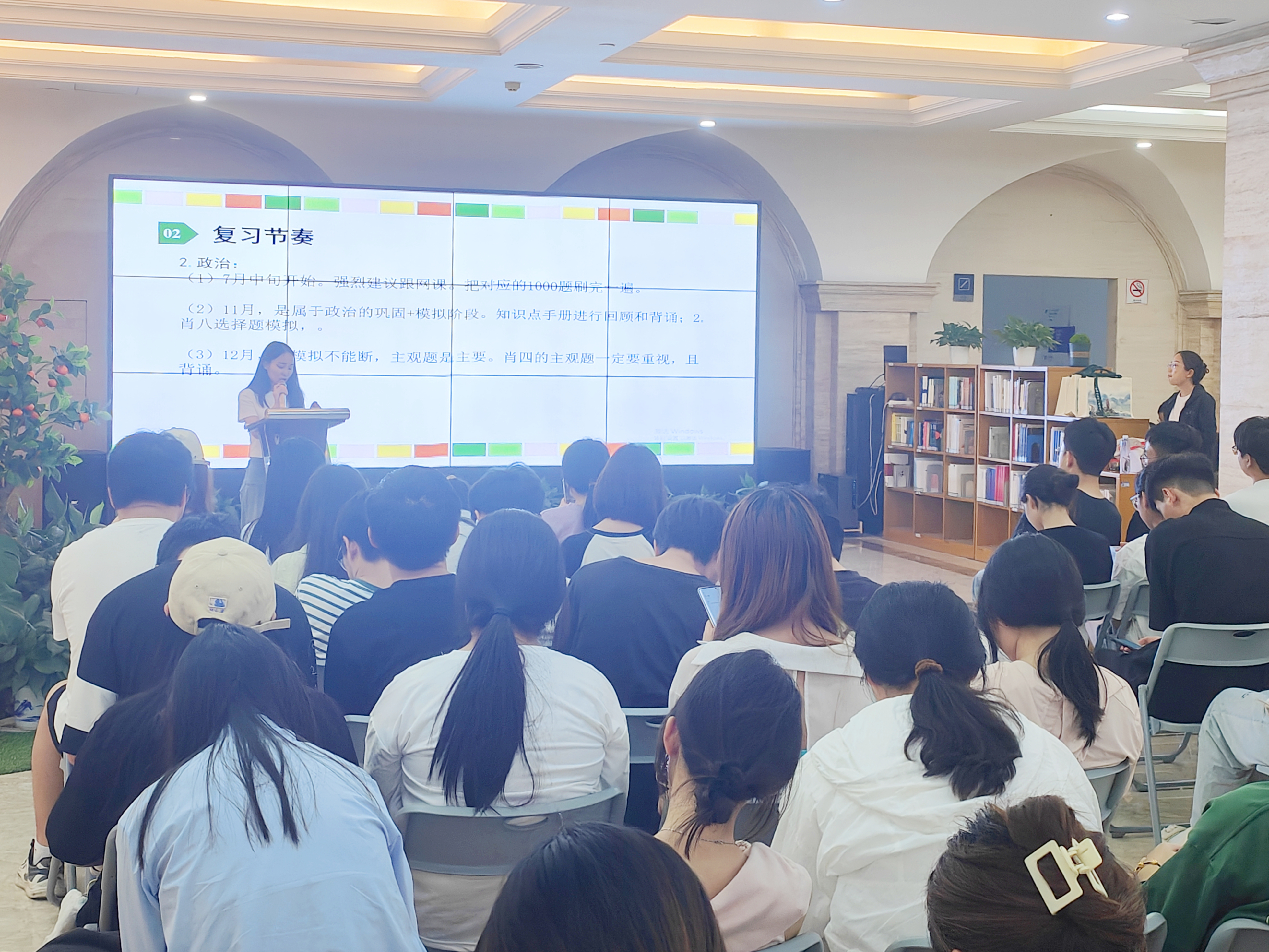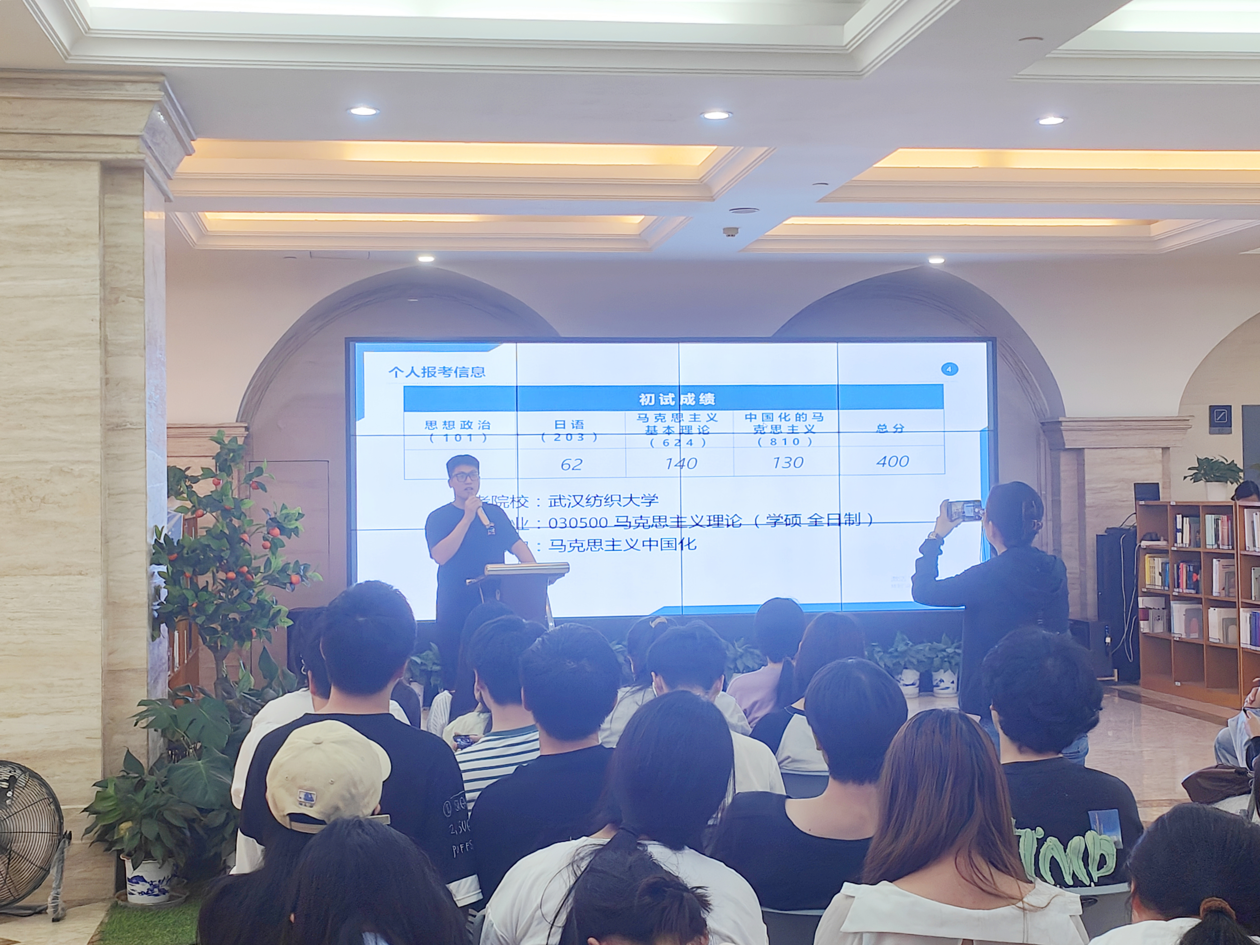 陈焕珮则更注重讲解政治复习的方法和策略,他讲述,他的政治成绩从原本的几乎垫底到现在的好成绩,都靠的是分块背诵,不断反复,才将成绩提升了上来。他还详细讲解了考研的时间顺序,以便学弟学妹们了解流程。最后他对学弟学妹们进行鼓励,放松心态,冷静沉着,富有耐心,最后定能成功上岸。