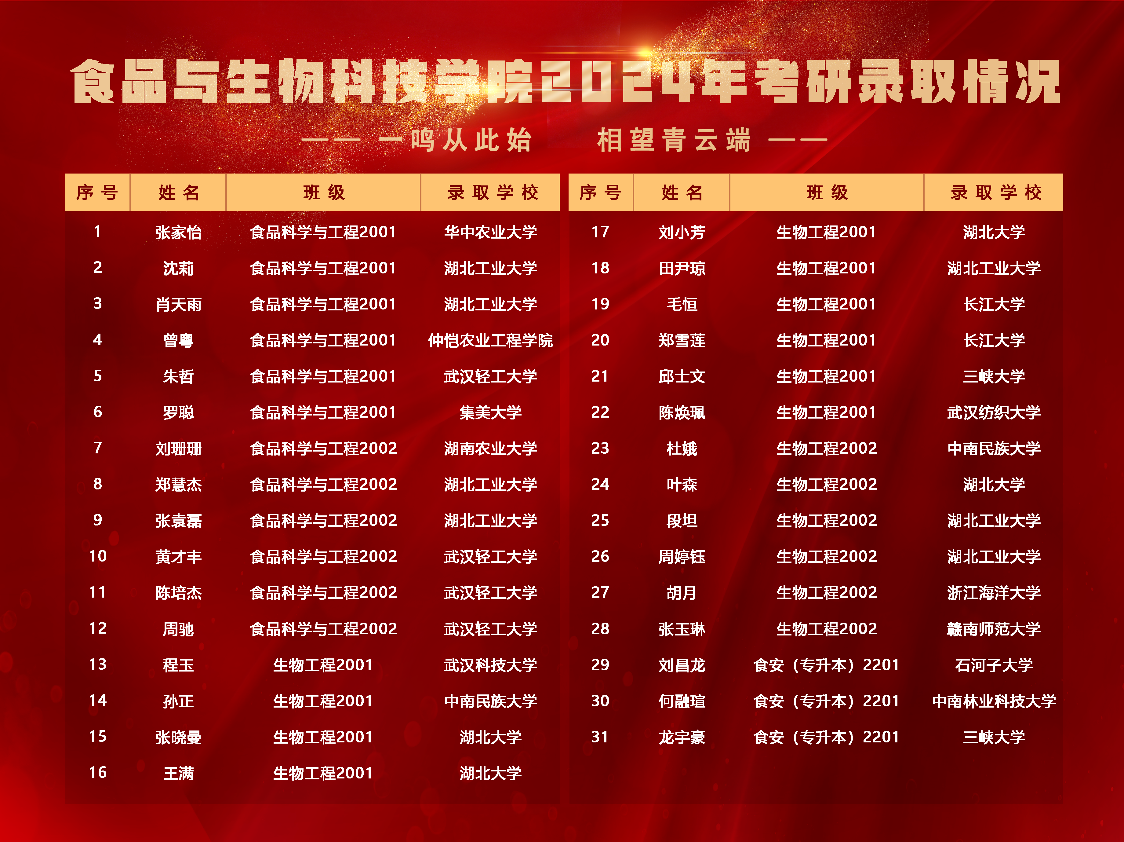 “我们的成绩,不仅来自个人的勤勉刻苦和锐意进取,同时也离不开学院和老师们四年来的关心与支持。”同批“上岸”的考研学子,生物工程专业程玉和食品科学与工程专业曾粤两名同学,均以复试第一的好成绩,分别被武汉科技大学和仲恺农业工程学院录取。两名学子在喜悦之余都对学院和老师在校期间为大家提供的全过程、全方位支持与服务表达了感激之情。