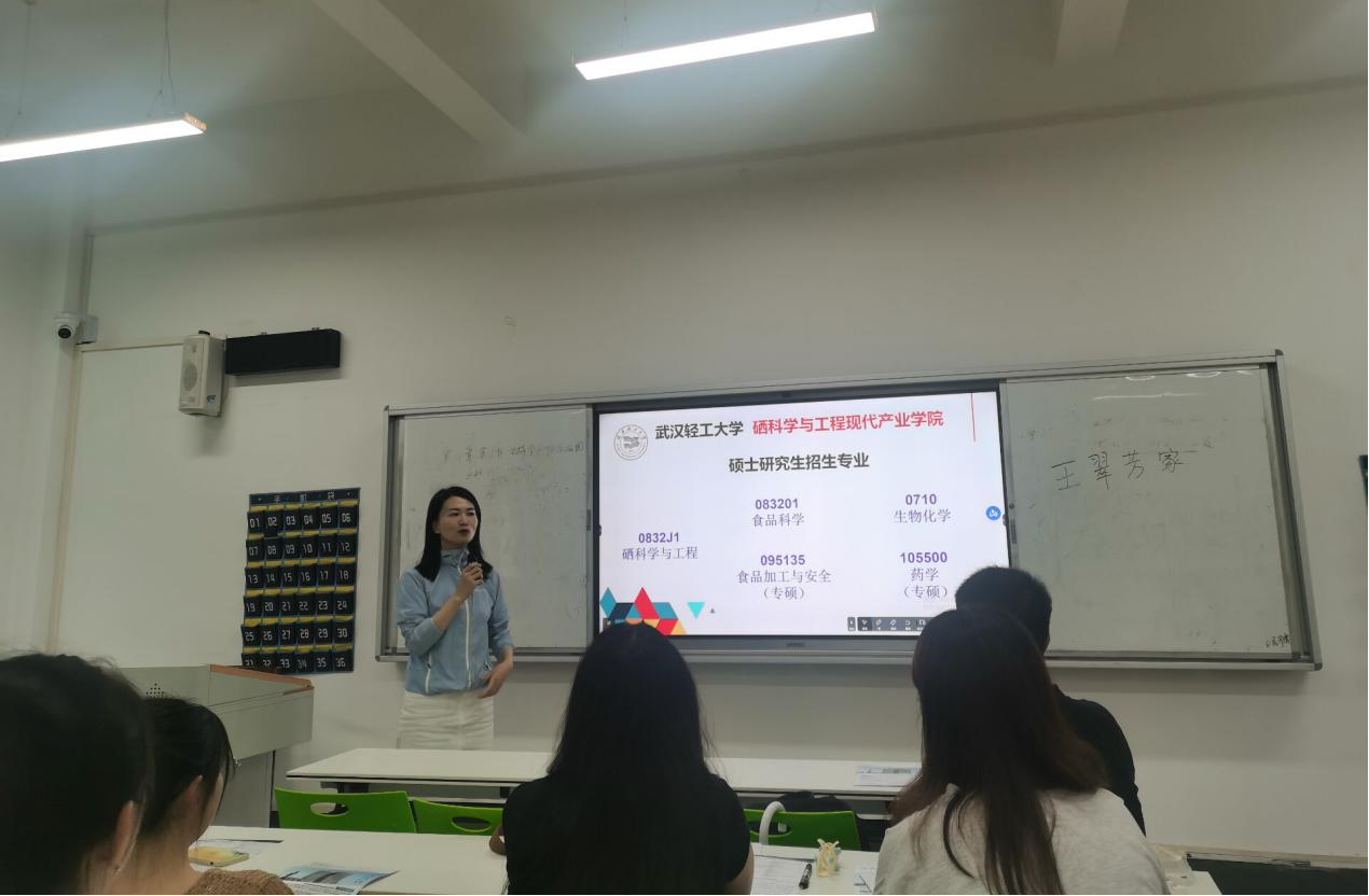 首先吴慕慈副教授向大家介绍了硒学院是依托武汉轻工大学,以轻工食品类学科为特色,以农产品加工转化为优势,聚焦“大食品大营养大健康”领域而成立的现代产业学院。招生专业有食品科学、硒科学与工程、生物化学与分子生物学等学硕和食品加工与安全、药学等专硕。随后从招生专业的考试科目、培养优势、招生形势等方面进行了详细解读。