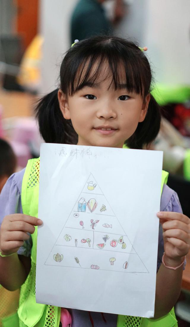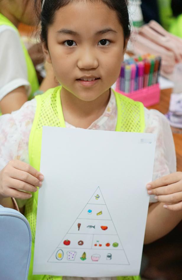 激发起孩子们的兴趣后,龚航利用PPT向孩子们讲解了更深层的食品营养知识,包括膳食宝塔的概念和食物相克性等内容。为了巩固所学知识,孩子们被鼓励用绘画的方式表达他们对膳食宝塔的理解,通过这种创新的教学方式,实践队不仅让他们在游戏中学到知识,还通过艺术表达加深理解,培养了孩子们对食品安全的持久兴趣和认识。