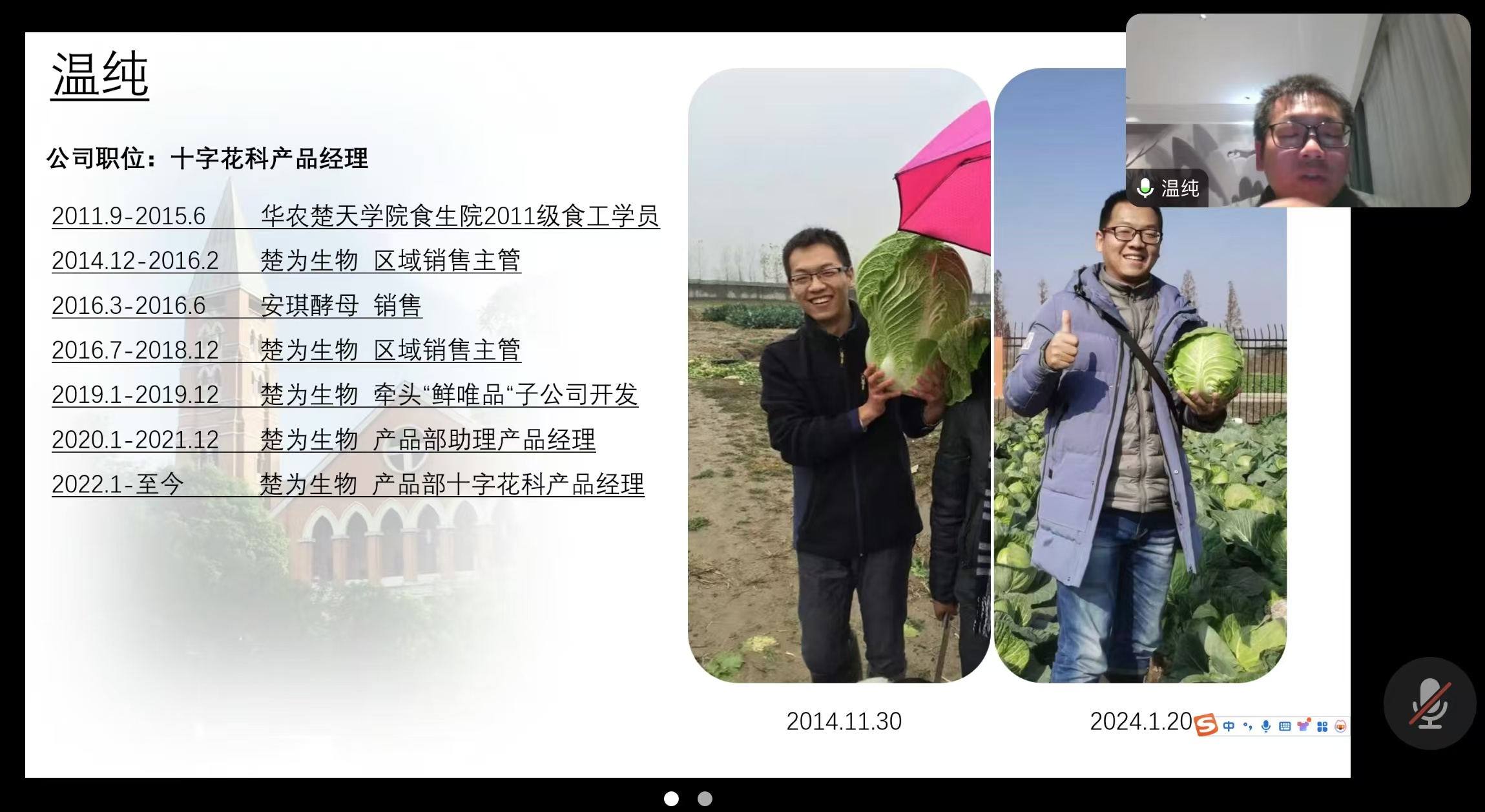 温纯于本科毕业后就职于武汉楚为生物有限公司,现任楚为生物有限公司产品部十字花科产品经理。在讲述职业经历的过程中,温纯分享了他对于工作的选择标准和原则,并提出了在职场中良性发展的四个关键词,分别是认知、定位、专注和勤奋。他以自己的职场经历告诉同学们,想要在学习和工作中有所得,需得深耕细作,笃行致远。