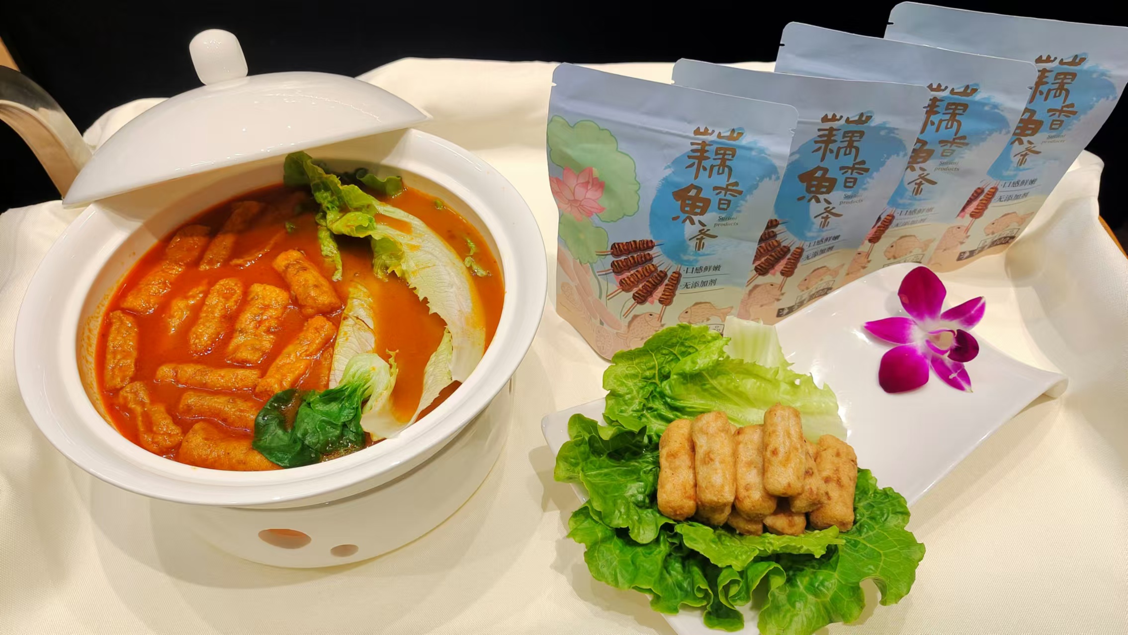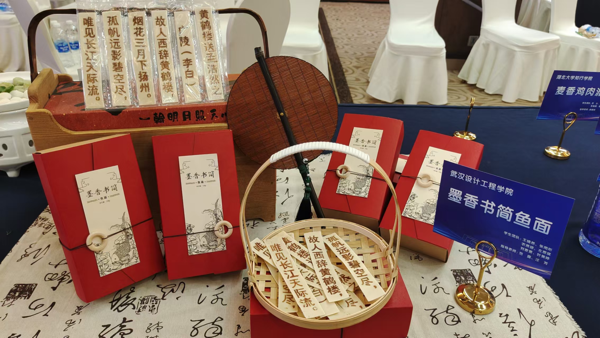 “故人西辞黄鹤楼,烟花三月下扬州。”我校“墨香书简鱼面”团队凭借一款印有诗词歌赋的鱼面条脱颖而出,该产品以书简为灵感,以鱼肉和面粉为主要食材,在传统鱼面制作工艺上进行大胆创新,革除蒸制工序,采用生面条搭配浮雕印字与酱油上色技术,赋予了传统鱼面独特的文化艺术价值。该产品不仅获得了现场评委的一致认可,更是引起了兄弟院校和企业人员的极高兴致,他们纷纷与团队成员进行交流探讨。