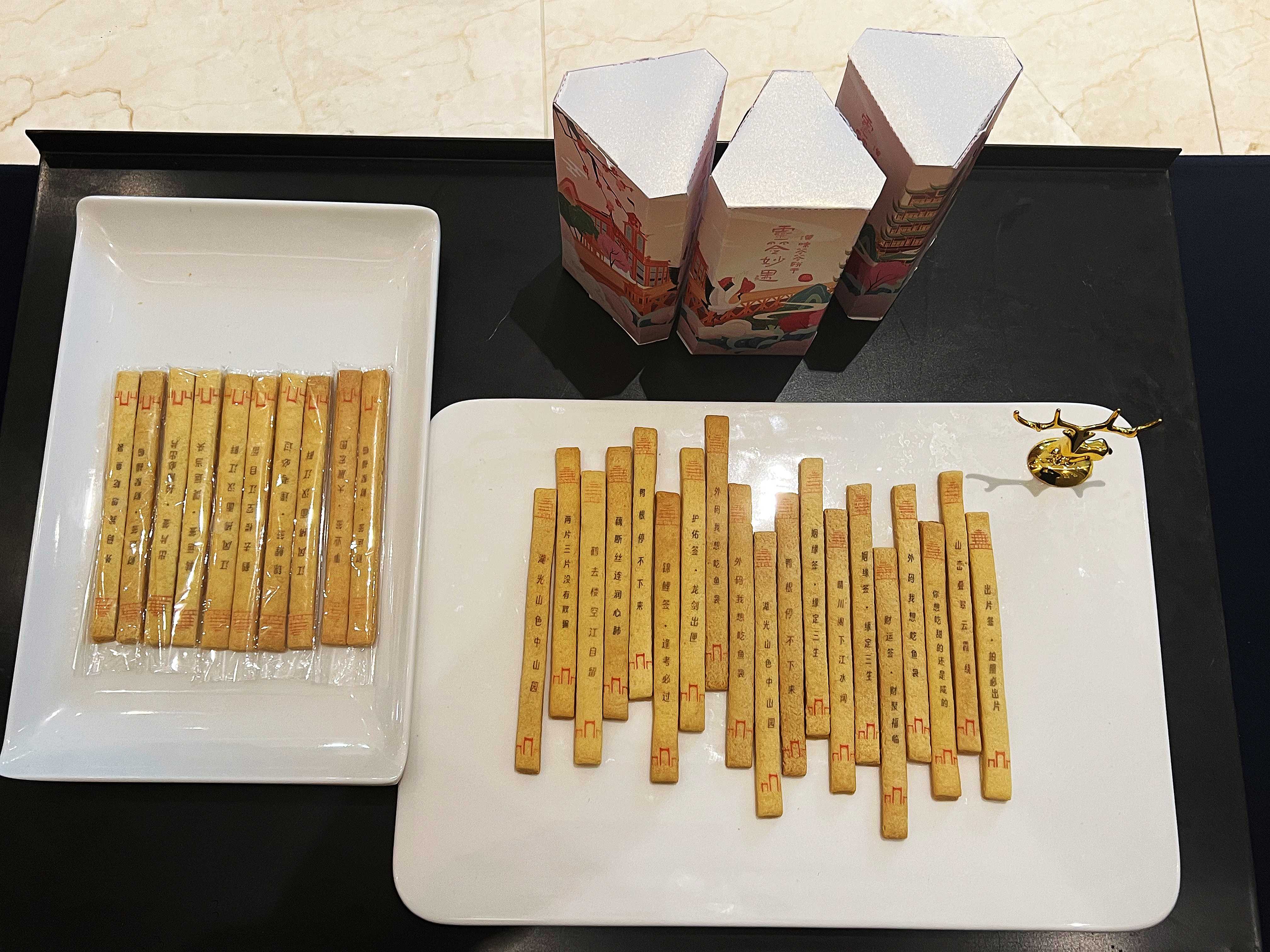 面点组一等奖作品灵签妙遇·汉味签签饼干以饼干为载体,通过文字传播文化与祝福,并结合地域饮食文化、盲盒抽签、养生保健风潮及武汉文旅IP进行设计,饼干中添加莲子、藕粉、山药、板栗等湖北特色原料作为功能成分,从武汉俚语、武汉文化、祝福语、减压、励志等角度选取设计文字内容并通过打印呈现于饼干上,消费者拿取食用时便能体验到抽签的乐趣,产品创意得到了评委的一致认可。
