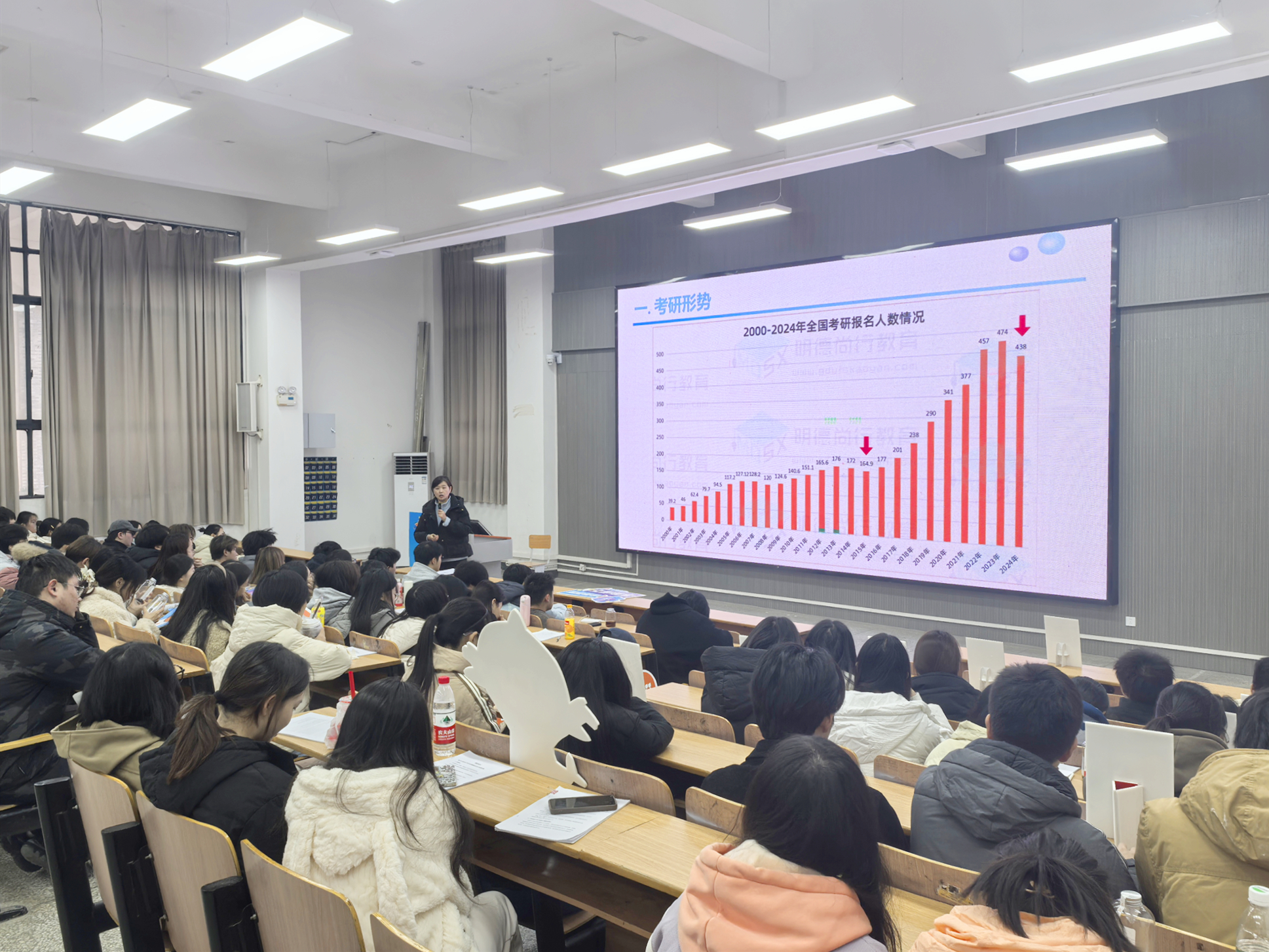 付晓燕首先对全国考研形势进行了详细介绍,接着从为什么要考研、如何科学报考、怎样做好准备等方面,重点宣讲了考研基本知识与报考流程,向同学们展示了近几年学院学子的上岸学校,分享了学长学姐的上岸故事,强调了考研对个人成长和职业发展的重要性,鼓励同学们坚定信心,勇敢踏上考研征程,积极迎接考研挑战,并根据自身情况做出最优报考选择。