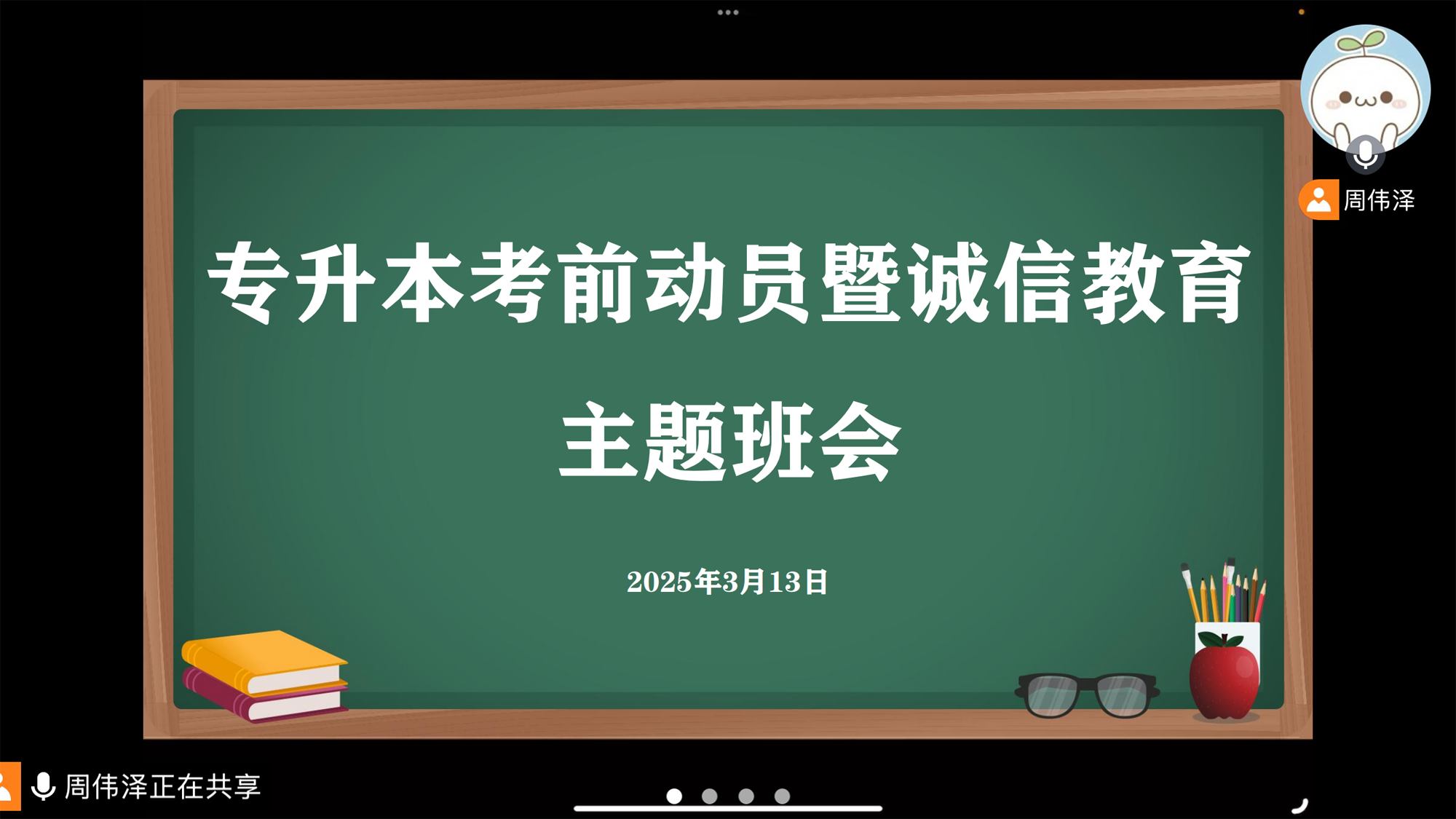 本网讯(通讯员 周伟泽)为扎实推进2025年专升本考试前期工作,强化学生诚信意识,打造风清气正的考试环境,保障考试平稳有序开展,6776永利集团于4月13日18:30,在腾讯会议召开专升本考前动员暨诚信教育主题班会,本次会议由25届毕业班辅导员助理周伟泽主持,25届报考专升本的全体学生参会。