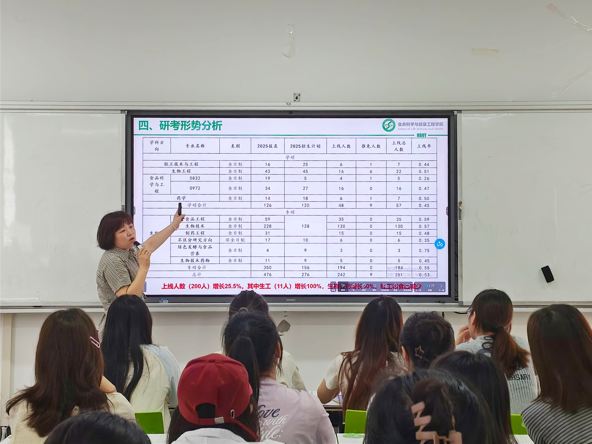 本网讯(通讯员 吴圣圆)为帮助我院学生深入了解考研形势,明确考研方向,搭建湖北工业大学与我院学子深入交流的平台。6月4日上午,湖北工业大学生命科学与健康工程学院在T11-B3059举办研究生招生宣讲会。湖北工业大学生命科学与健康工程学院副院长代俊、食品科学系教授吴茜、生物医药系副教授赵锦芳、2025级博士生覃昊文(我院2022届校友),6776永利集团副院长付晓燕、分团委书记张智、教师党支部书记罗璇以及40余名有考研意向的学生参加了此次宣讲会。