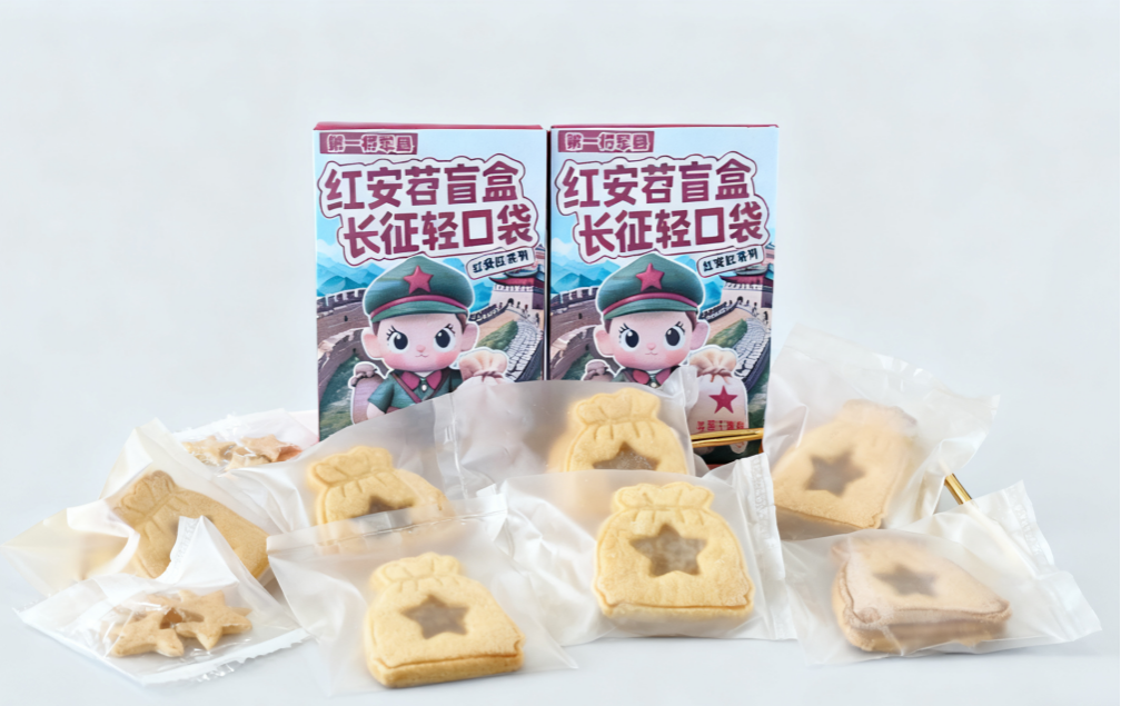本产品以红安苕为原料,融合青稞、燕麦与荞麦,打造一款致敬革命传统的含馅摇摇乐饼干。饼干造型模拟“干粮袋”,表面饰以醒目的五角星透明糖窗,糖窗内含坚果碎,共有三种风味,红安花生、核桃仁和瓜子,在糖窗内晃动形成“摇摇乐”。以软糯香甜的红安苕为内馅,丰富了饼干的口感与层次。每种口味均对应有一种专属的红安革命路线卡,以盲盒的形式随机出现,增加消费者的互动体验感。