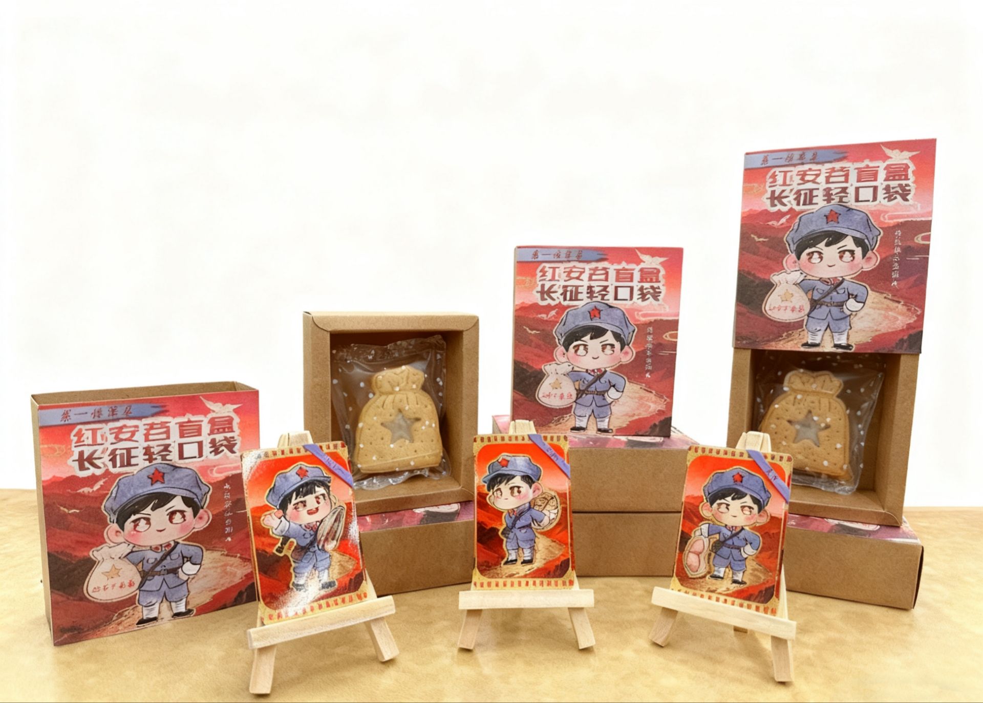 “红安苕盲盒·长征轻口袋”是一款融合红安红色基因与特色美食的创新食品盲盒。外观复刻“红军干粮袋”,缀五角星透明糖窗,自带红色辨识度。盲盒内随机搭配专属革命路线卡,印有人物形象、旧址介绍与路线图,吃美食之余可打卡红色景点。集收藏趣味、文化体验与健康饮食于一体,让红色故事随美味走进日常。