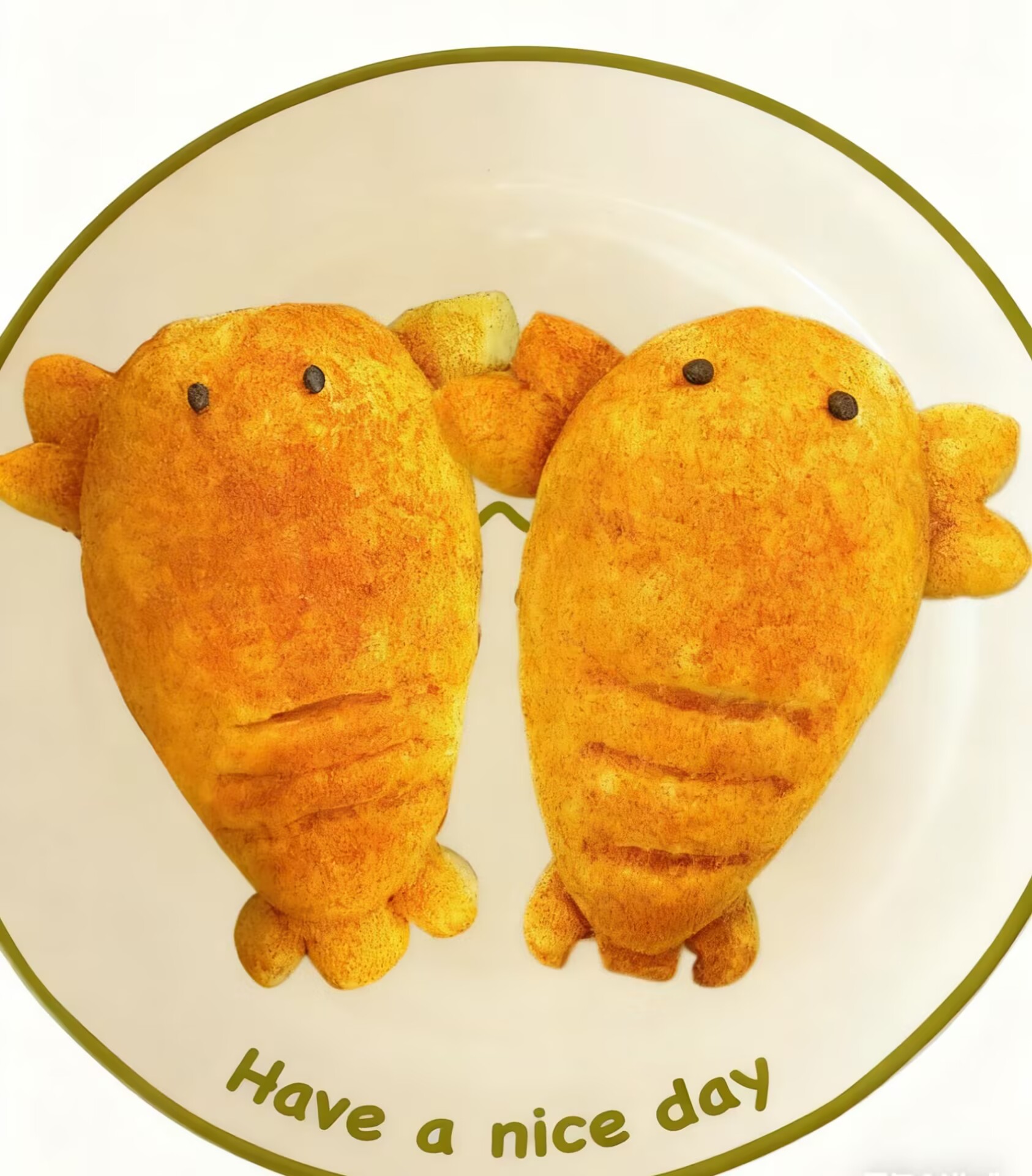 本项目以湖北特产小龙虾为灵感来源,以高筋面粉、恩施土豆泥等为主要原料制作面包皮,以小龙虾肉、玉米等为馅料,开发高蛋白、高纤维健康配方的面包。以小龙虾外观形象为目标,制作形似小龙虾的面包,撒上甜椒粉,点缀黑色眼睛,萌趣还原小龙虾的外观形态,提升产品趣味性和吸引力。