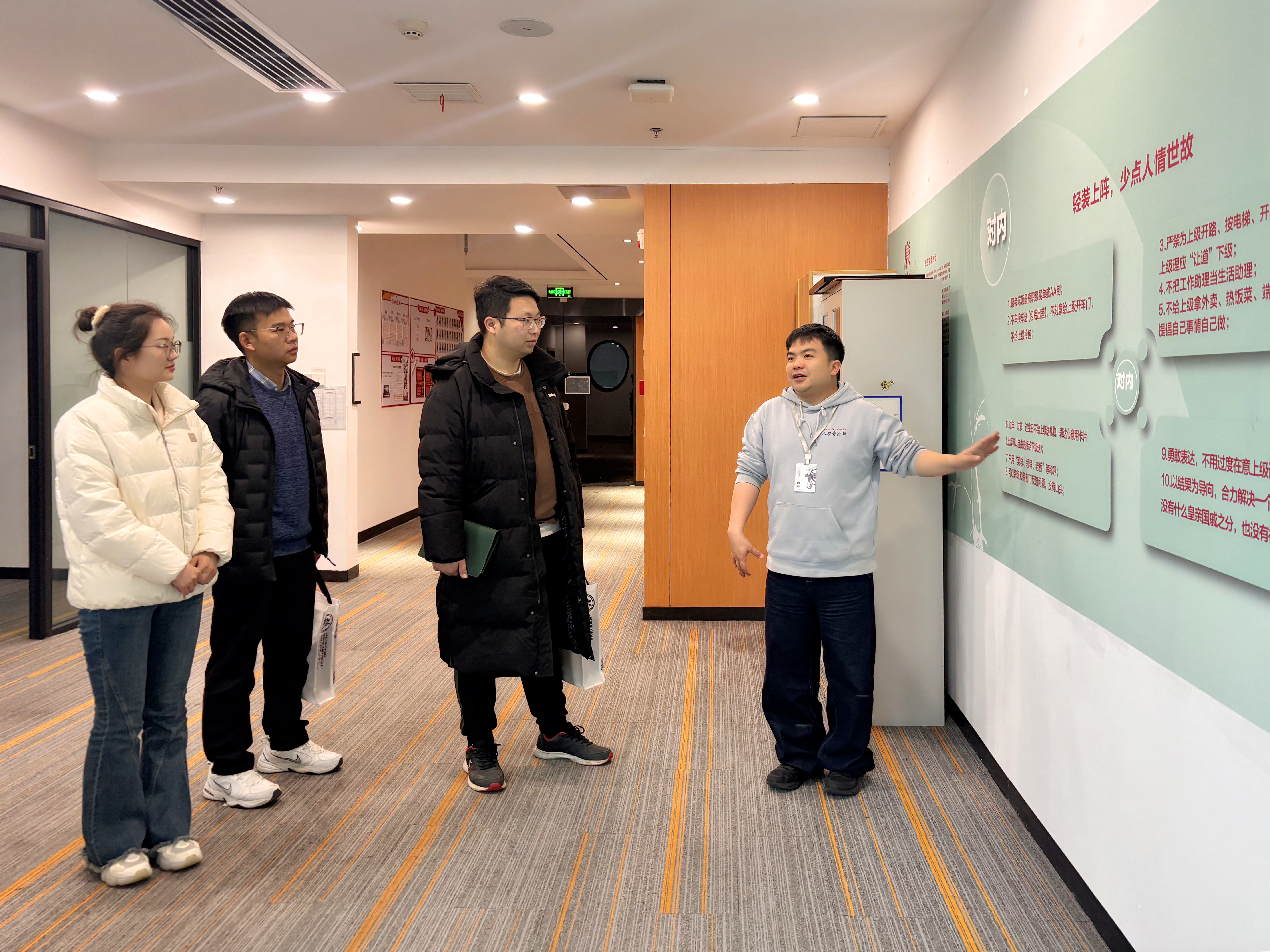 交流结束后,在王翔的带领下,走访团队参观了茶颜悦色文化展示区,通过图文展示、实物陈列等形式,深入了解了企业的品牌内涵、产品研发理念和企业文化建设成果。随后,团队前往长沙五一广场,实地参观了多家茶颜悦色概念店,近距离观察了门店运营模式、产品陈列方式和新式茶饮空间的设计,对企业的实际工作环境与前沿业态有了更直观的认识,进一步加深了对企业经营理念和品牌影响力的认知。