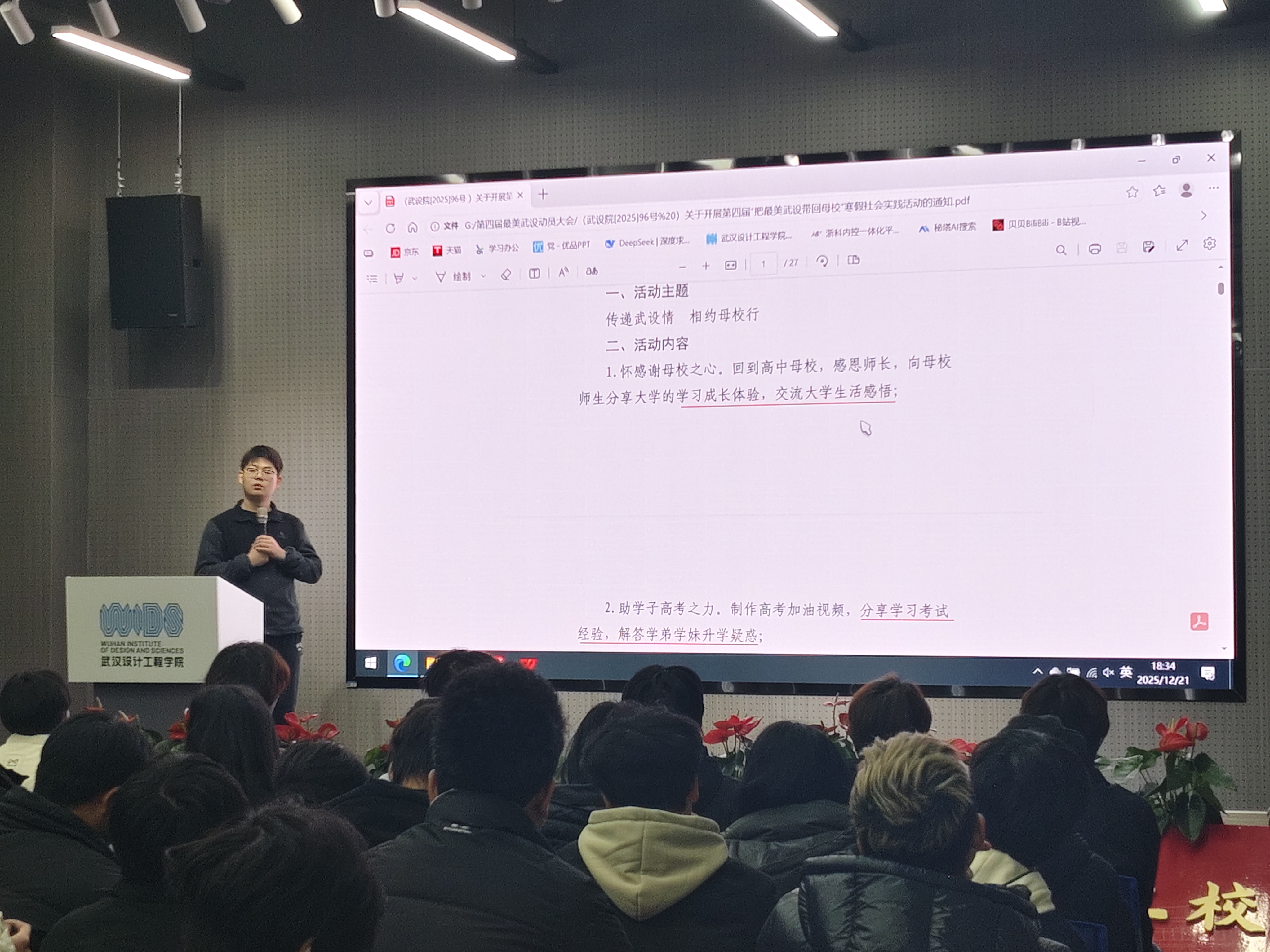 辅导员马冲老师首先解读活动文件,明确本次大会聚焦的“传递武设情 相约母校行”主题活动核心任务。马老师强调,同学们回到高中母校,既是“汇报者”,要把在食生院的学习收获、成长蜕变讲给师长听,让母校为自己的进步骄傲;也是“引路人”,要把高考备考的“干货”经验分享给学弟学妹,用自己的经历帮他们驱散升学迷茫;更是“武设代言人”,要带着对学校的热爱,全面介绍武设的校史底蕴、学院的学科优势、人才培养特色和招生政策,让更多优秀同龄人了解武设、选择武设,为学院注入新的发展活力。