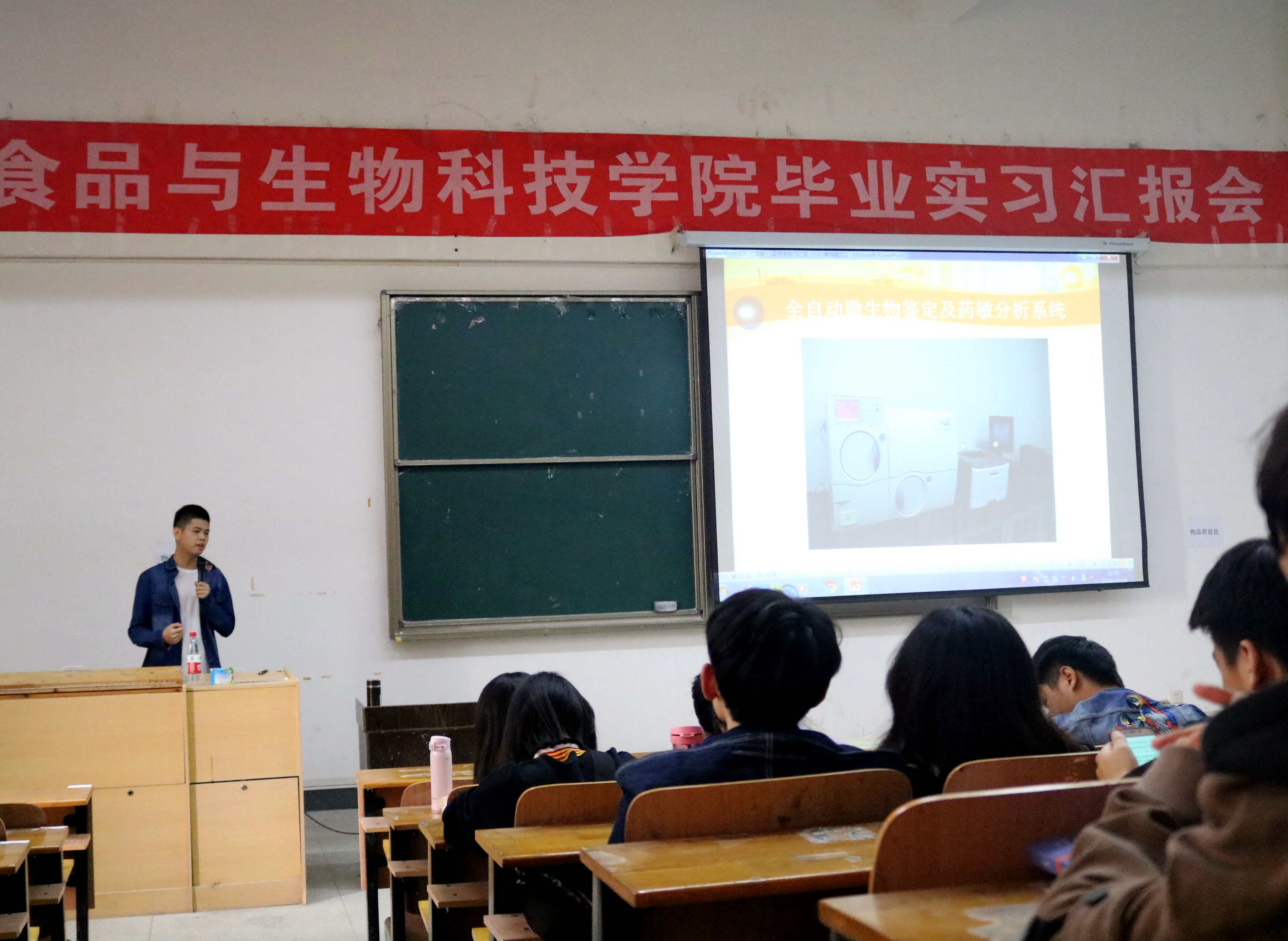 学院选取15级各个专业优秀的实习代表上台汇报他们的实习总结。其中徐军武同学在武汉黄鹤楼酒业(咸宁分区)有限公司实习,他围绕酒业介绍、酿适和包装工艺、能力知识的培训、实习生活、收获五个方面来讲述实习经历。孟祥宇同学所实习的单位是湖北省食品质量安全监督检验研究院,他分别从单位简介、实习内容和实习心得三个部分阐述实习经过。另外从家乡实习部门——广东省清远市佛冈县食品药品监督管理局实习归来的黄钰童同学,从单位部门介绍、工作内容和实习感想三个方面为在场的同学们讲述自己的实习经过,还举了自己买菜、做检验等实习例子,总结出自己学习上的短处。六位同学的分享让老师们了解了他们的实习收获与成果。