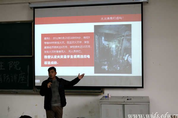 19日19:00,方娜老师在临湖轩A2019为18级全体学生召开消防知识讲座。她从校外三例高校失火案入手,着重分析了违规使用电器、乱接电线、随手丢弃烟头等行为造成的严重危害。再列举出从2012年以来我校发生火灾的五起真实案例,让同学们深刻意识到:火灾其实离我们并不遥远!