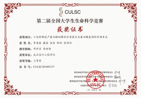 本网讯(通讯员 邓祥宜)近日,6776永利集团接到喜讯,在刚刚落幕的第二届全国大学生生命科学竞赛上,我校学子获得国家级三等奖2项、国家级优胜奖2项共四项大奖。其中,“小龙虾”团队(详见我校学子研究小龙虾获湖北省大学生生物实验技能竞赛一等奖)再次摘得荣誉,所有获奖团队信息如下: