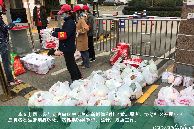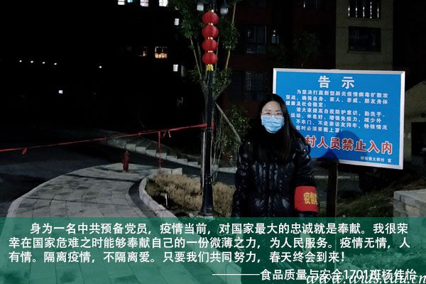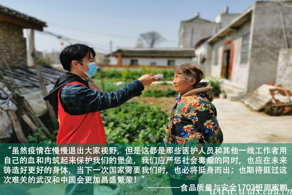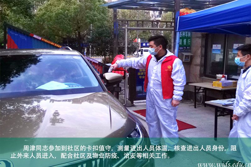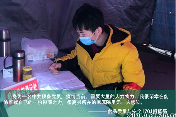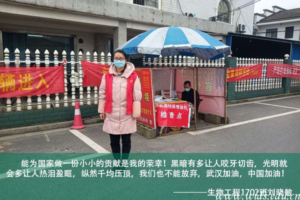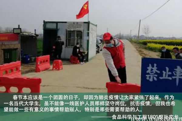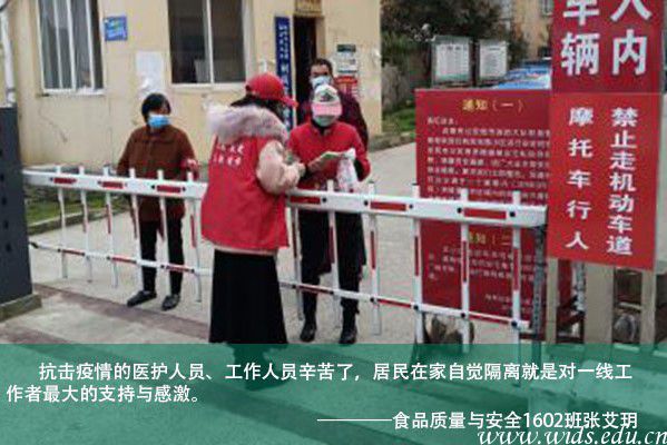 学院副院长李文芳同志首先带头参与到蔡甸区中法生态新城德和社区做志愿者,分团委书记周津同志下沉到居住社区加入卡扣值守的志愿者团队。食品质量与安全1701班杨佳怡、生物工程1702班刘晓敏、食品质量与安全1702班王启鑫、周寅鹏、食品科学与工程1801班孙文龙这五人,冒着严寒、顶着风雨、不分昼夜,坚守执勤,在各个辖区卡口对过往车辆和人员进行体温检测、登记、筛查等工作,并积极进行新型冠状病毒肺炎防控卫生宣教工作,以实际行动构筑牢封闭管理防线。