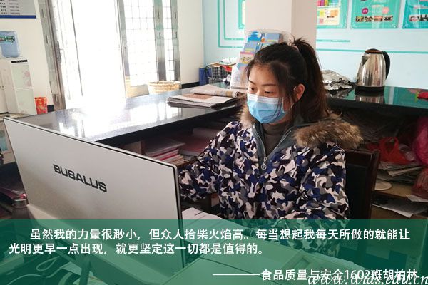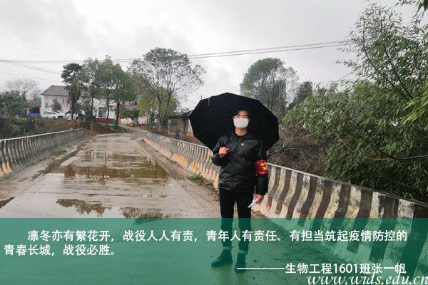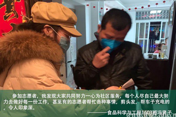 生物工程1601班张一帆、食品质量与安全1701班袁志宏、食品质量与安全1802班张宇娟、食品科学与工程1801班马驰,主要负责登记相关地区信息记录和制作表格(返乡离乡人员信息、卡口出入人员信息、体温信息)。马弛一边忙着在家乡参加志愿者助力战疫,一边不忘用自己的创意为武汉加油,在疫情最严重的的时候,动员身在各地的武设学子给武汉加油,短短两天时间,就有六十多位同学响应,剪辑出来的视频还受到了人民网的报道。