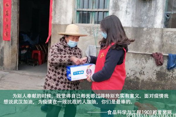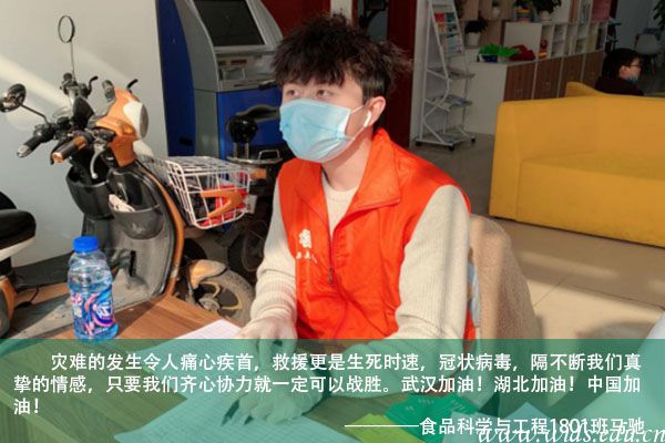 虽然普通学生无法凭个人力量筹集十分紧缺的物资,来支援抗疫一线,但生物工程1701班郭赵瑞利用学校“五色阳光志愿服务队”优质平台,积极动员在家志愿者投身武汉疫情物资转捐赠对接工作。在他的带领下,食品质量与安全1802班黄国威等志愿者分工协作湖北省慈善总会与各捐赠方之间进行物资对接和核查工作;与此同时,他们联络湖北省各个医院咨询它们对于自煮火锅的日需求量并安排配送,使一线医护工作者能够随时就餐、改善伙食。