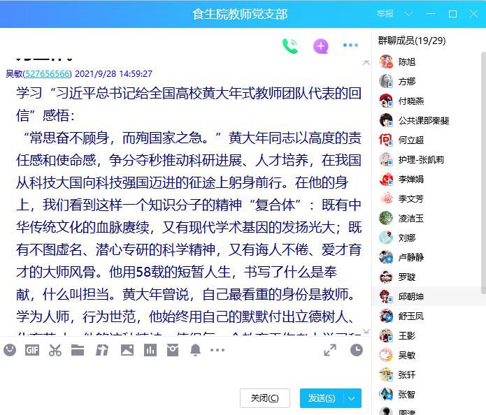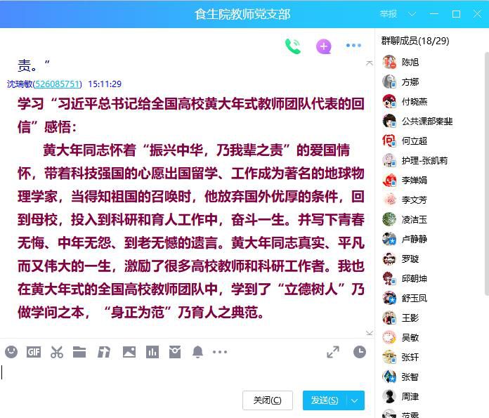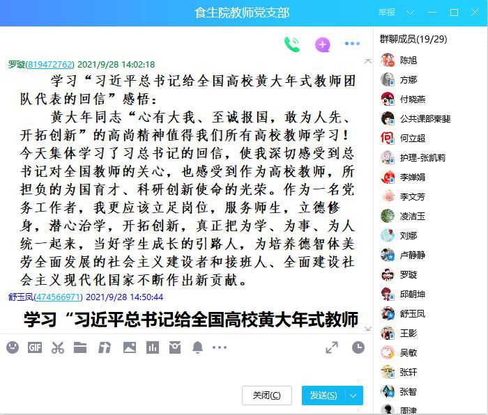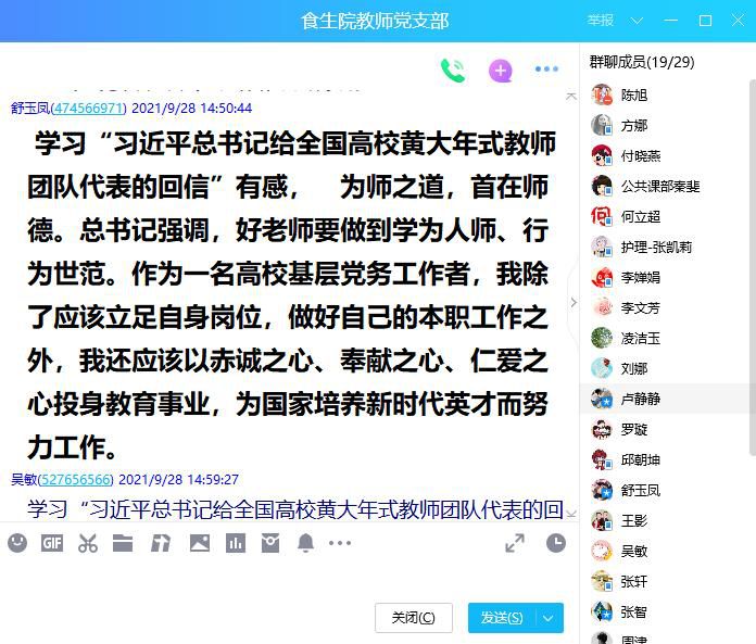 会上李文芳书记领学了“习近平给全国高校黄大年式教师团队代表的回信”,并要求全体党员教师对习近平总书记重要回信精神,开展深入学习研讨。罗璇领学了2021年8月18日人民日报上“王沪宁出席第二十七次全国高校党的建设工作会议的相关讲话精神”。王影和吴敏领学了人民日报“关于高校党建和思政工作进展成效综述”。通过学习,教师党员们进行了激烈的讨论,纷纷发表了对“习近平总书记给全国高校黄大年式教师团队代表的回信”的感想体会。