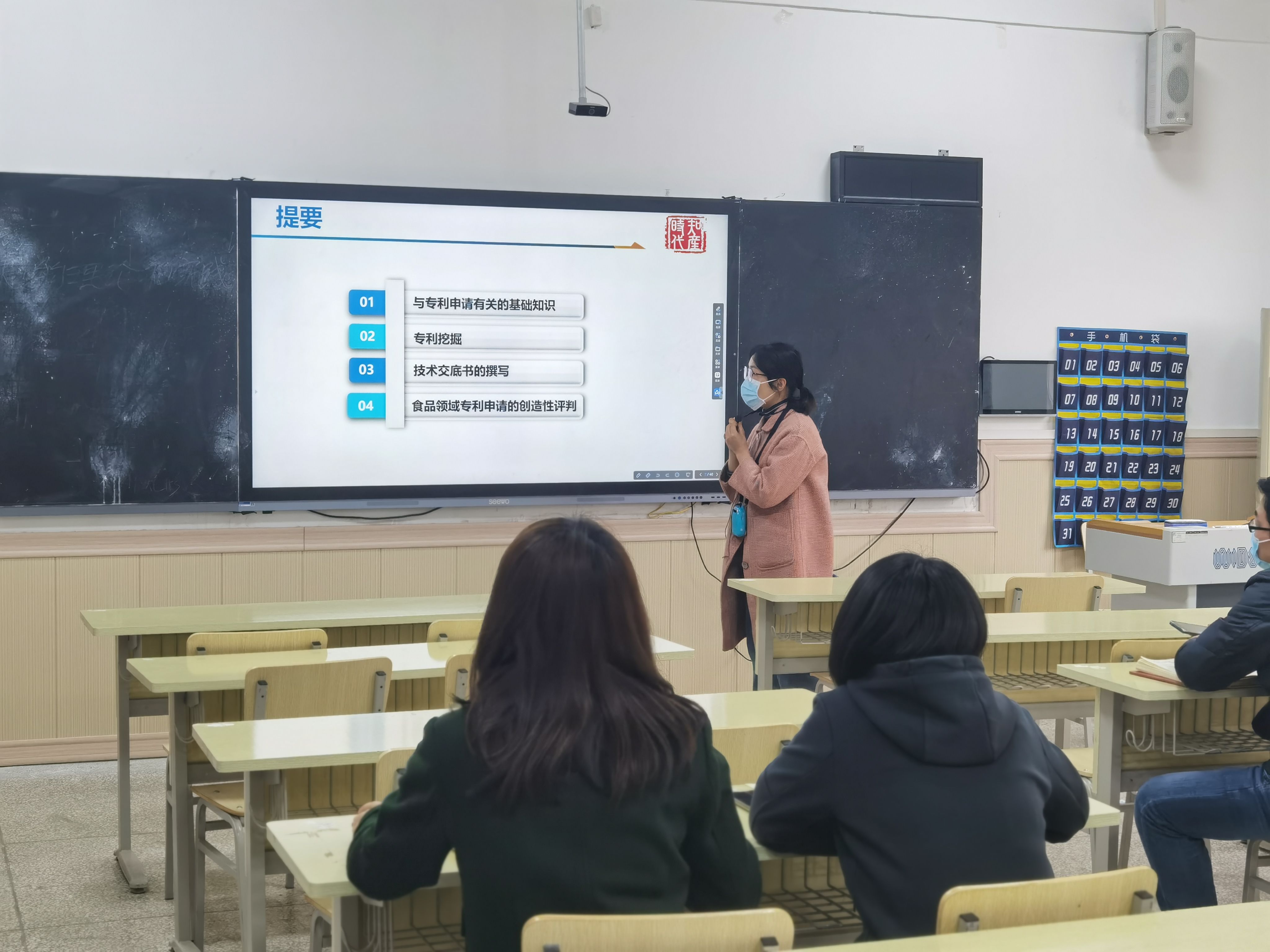会上,胡老师结合实际案列,从专利基础知识、专利申请文件(技术交底书)撰写、专利挖掘、食品领域专利申请的创造性评判等四个方面进行了较为详细的讲解。讲座内容引发了专业教师们的极大兴趣,讲座结束后,教师们与胡老师进行探讨交流,进一步加深了对讲座内容的理解和掌握,产生了很好的效果。