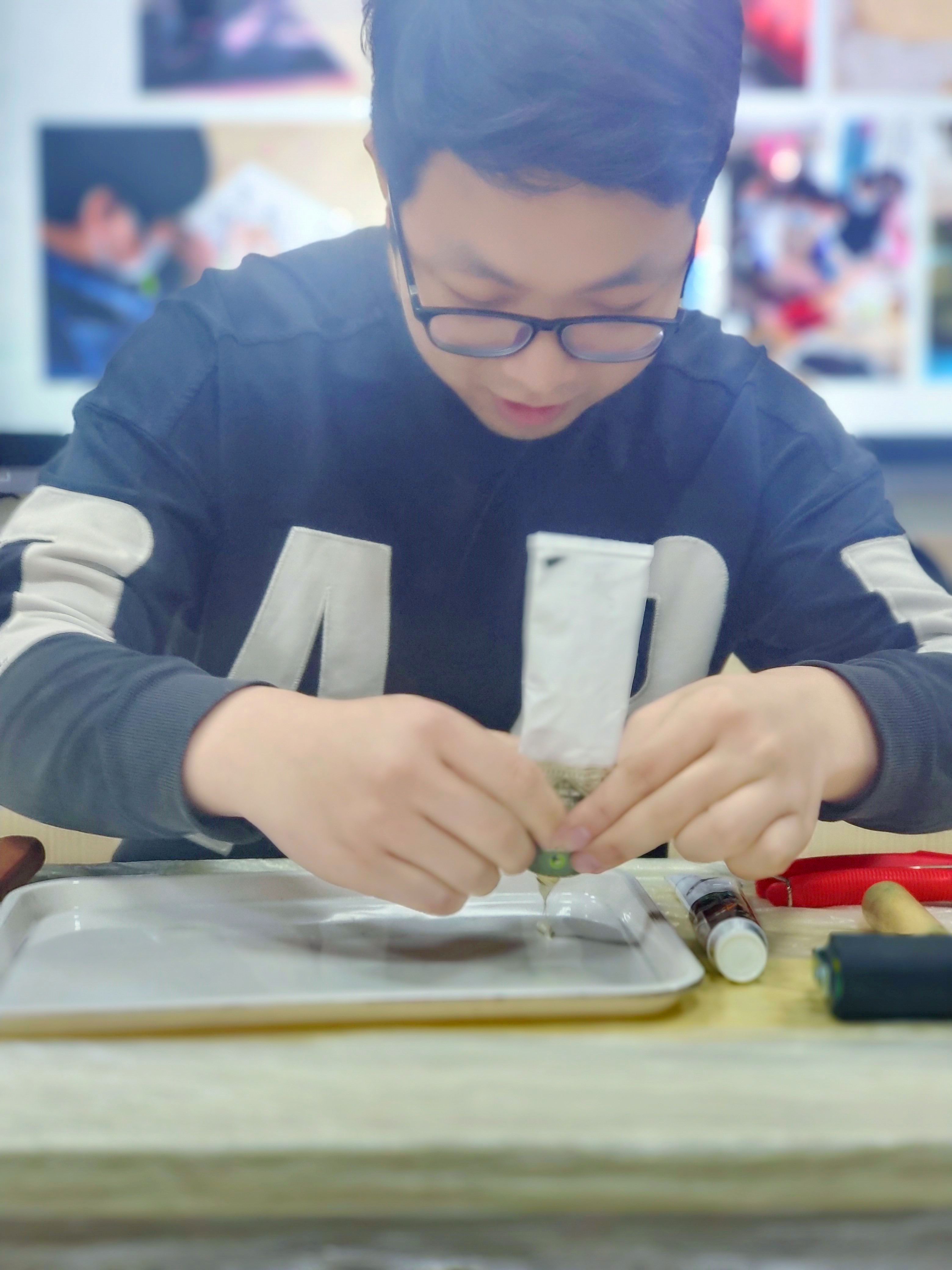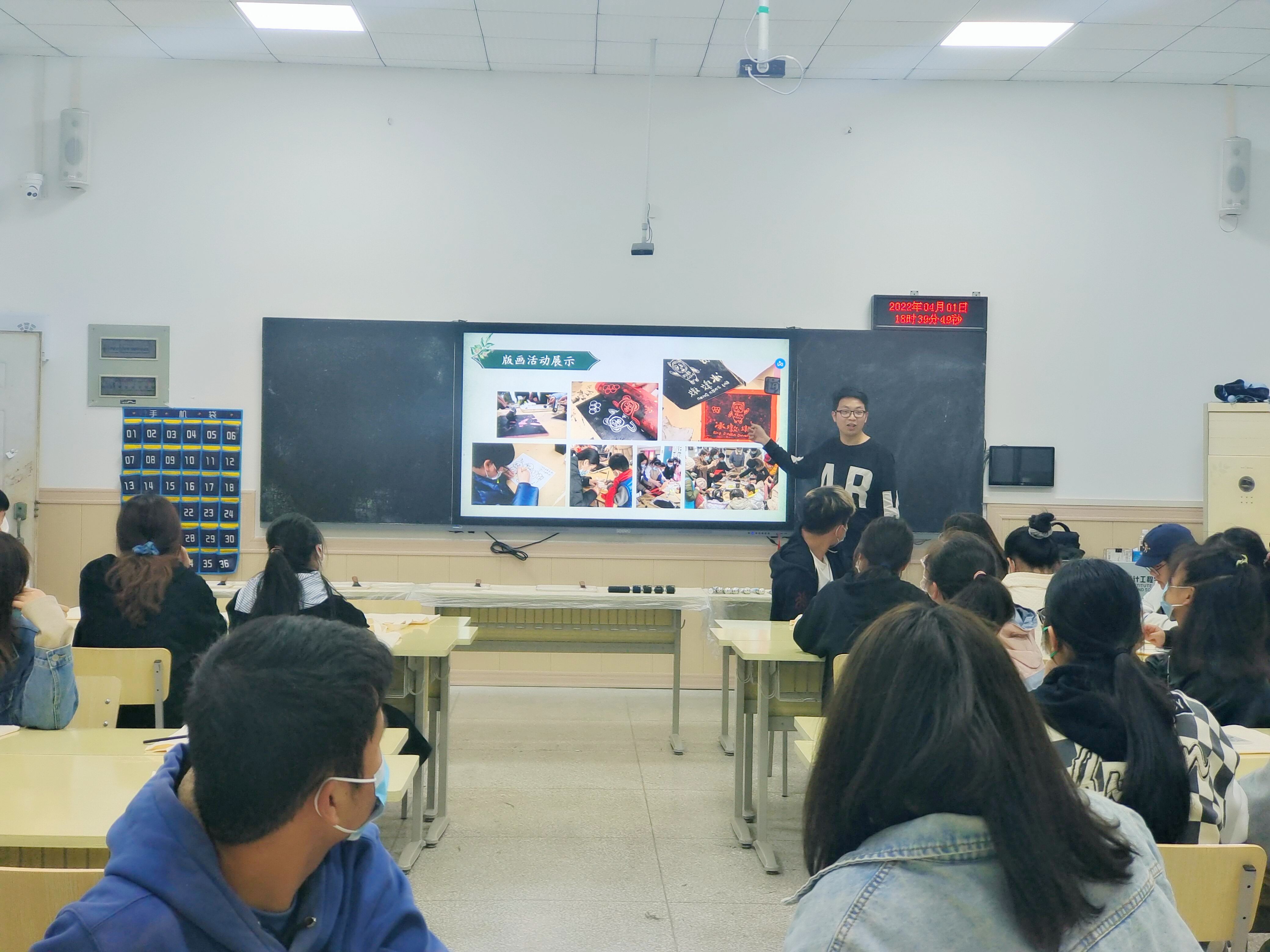 首先由张智老师为大家进行了活动的介绍,并向大家讲解了该如何完成版画雕刻及最后的拓印。讲解完成后,便是同学们的自由DIY环节,参加活动的三十多位同学分成了五组而坐,来自大一至大三不同年级的同学就这样坐在了同一个活动场地。大家在完成自己作品的同时,还会积极的为身边的同伴提出建议和帮助,也有同学会去借用雕刻较好的同学的图案,或是将自己和同伴的图案进行拼接和交换,用来丰富自己最终的版画成品。与此同时,参加活动的每位同学的白布袋子上都印有我们食生院的标志。